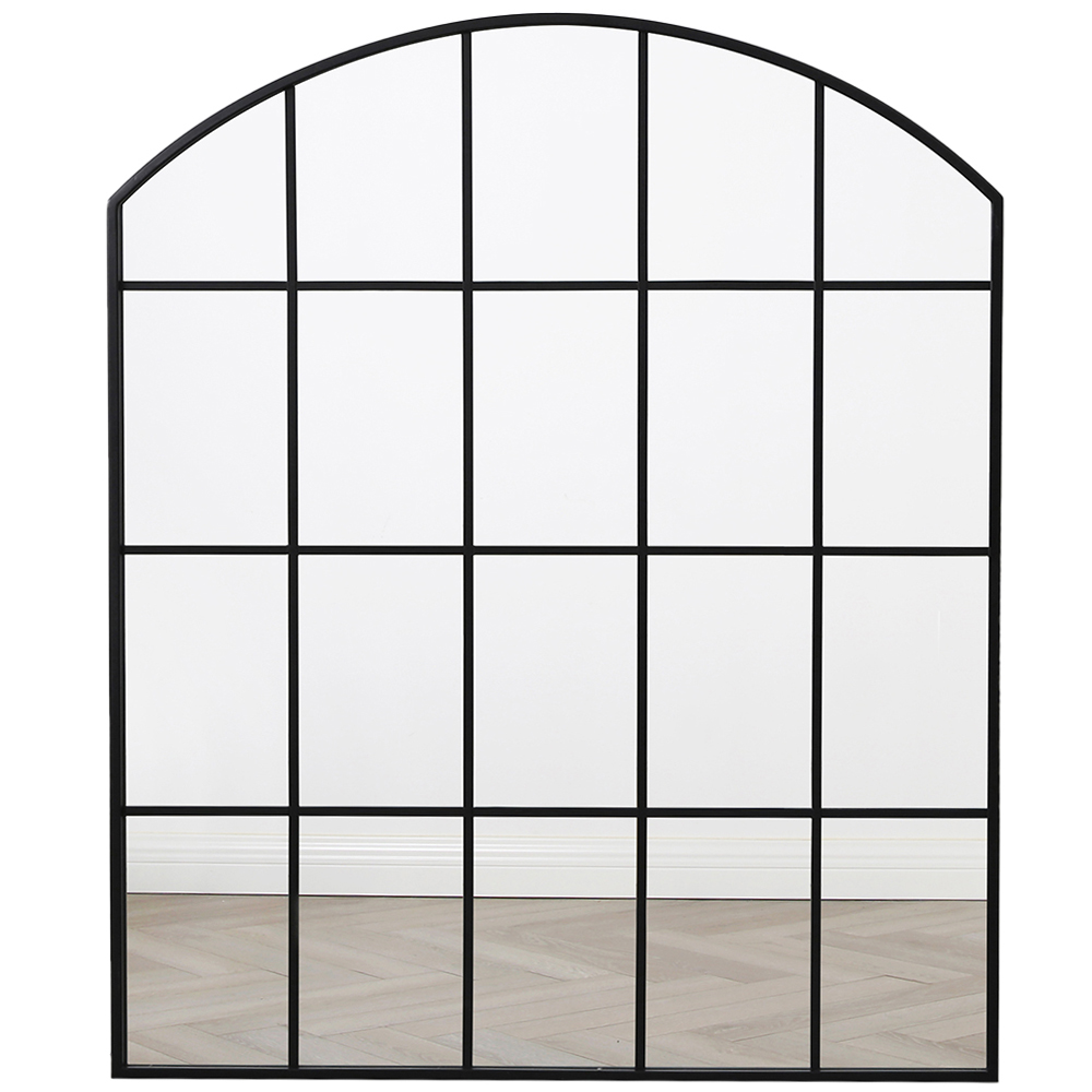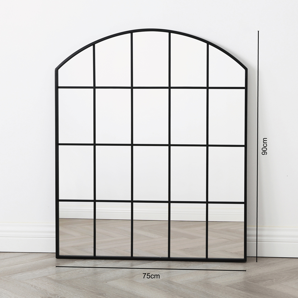 Bring light and life to your walls with the Home Garden Direct Aion Black Arched Industrial Wall Mirror 90 x 75cm. It has a classic black metal frame that gives it a timeless look and adds elegance to any room. Its unique arch design makes it a standout piece, serving as both a decorative wall mirror and an industrial accent. This mirror is perfect for your daily grooming routine and helps create the illusion of a larger, brighter space. It can also serve as a beautiful focal point in your decor. With its full-length functionality and sturdy design, this industrial-style mirror is a reliable choice for enhancing your living space. Plus, it features four hooks on the back for easy hanging.