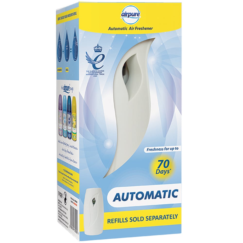 The Airpure Automatic Air Freshener sprays fragrance at intervals of 9, 18, and 36 minutes to keep your home smelling great. Thanks to the battery-powered design, the automatic air freshener can be placed in any room, keeping your space smelling fragrant and inviting. It offers freshness for up to 70 days and can be easily refilled for less waste.