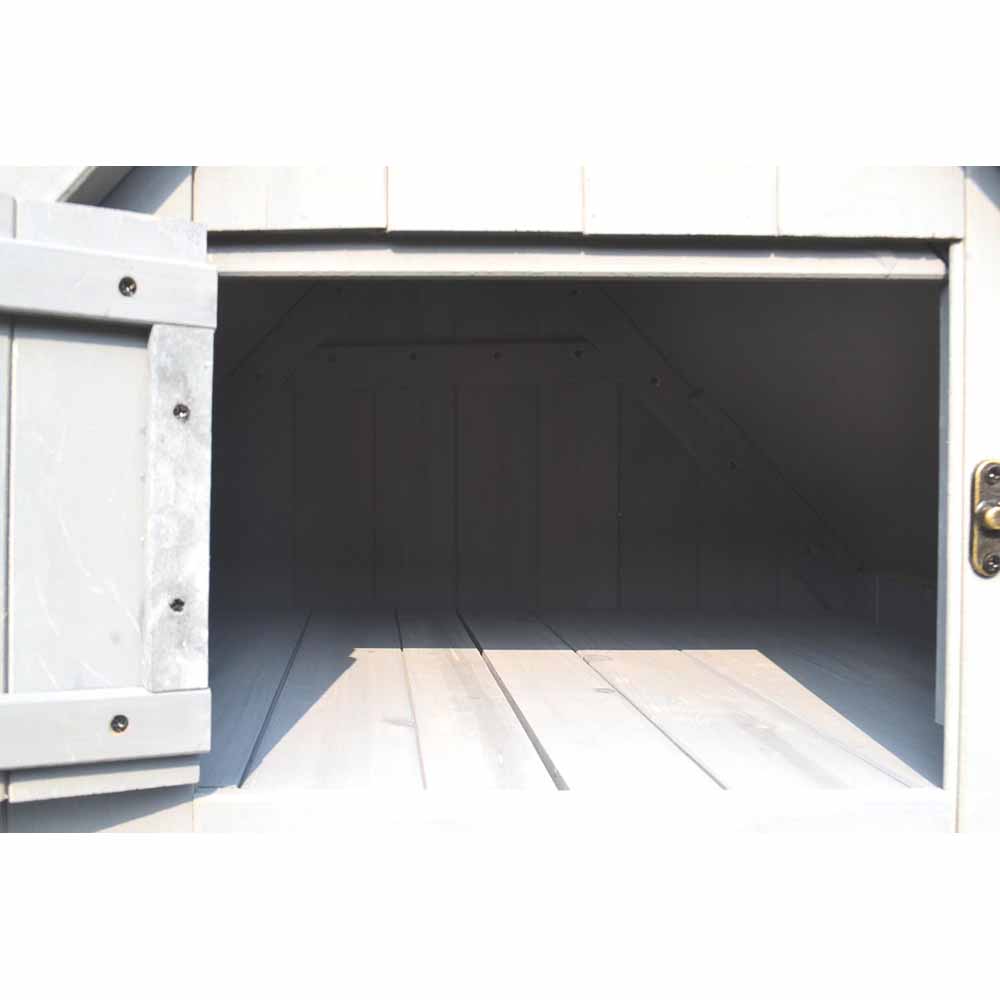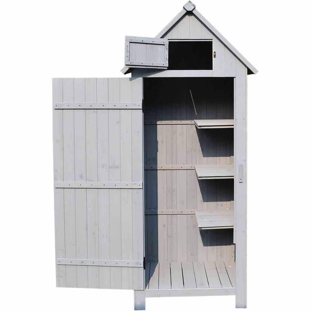 Bring order to your gardening tools with this stylishly designed Bideford tool wooden shed. This grey colour tool shed with three alternate storage spaces on the inside is designed to accommodate smaller and larger items. Featuring three half-sized shelves to keep smaller items secure and organised, it also has an extra upper shelf cleverly incorporated into the roof to offer plenty of space for horticultural essentials like weed killer, trowels, and gloves. The other half of the shelf has ample space for storing long-handled tools such as spades, rakes, and forks. A padlock can be attached to a metal latch, offering safety to your items. The shed made from highly durable Chinese fir wood obtained from managed sources offers weather resistance. It has a heavy grade mineral roofing felt and a wooden drop latch, so you can rest assured that your garden tools and equipment will be kept secure from rain, wind, and snow. Self-assembly required. Supplied flat packed. Colour: White. Dimensions: Internal: H125 x W63 x D43cm, Large Door: H123 x W51cm, Small Door: H25 x W35cm.