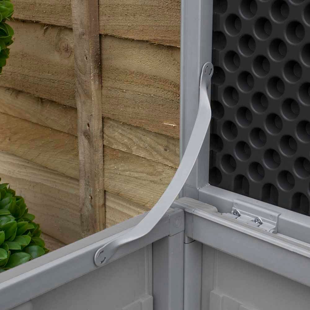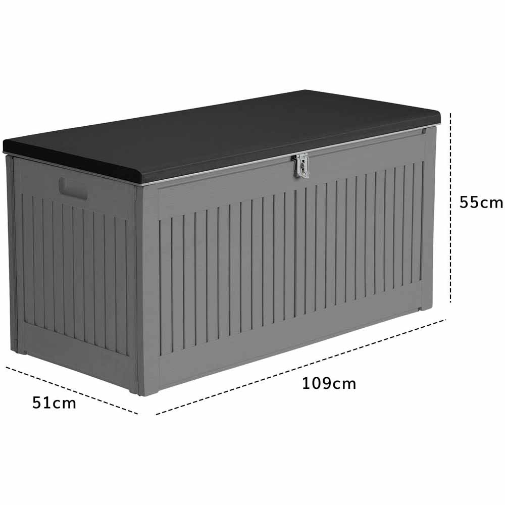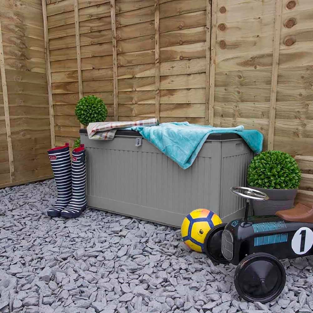 Store all your garden tools, games, furniture cushions, wellies and other accessories safely in this plastic storage box. The garden storage box built to be resilient and hard-wearing is a reliable storage solution for your outdoor items. Made from durable and long-lasting polypropylene plastic, you will find this storage box dependable as you use it to store your garden stuff for many years to come. Weather-resistant and fade-free, you can rest assured knowing that the contents of this chest will be kept safe from harsh weather conditions. The built-in handles allow easy transport in and around your home. It is lockable with a plastic hasp for attaching padlock for added security (padlock not included). With plastic hinges to give extra support and the ability to hold up to 200kg on the lid, it doubles up as extra seating at garden parties. It is designed in a decorative wood effect pattern for a sleek natural look, making it as stylish as practical it is. Easy to assemble with flat-pack design, designed to keep items inside dry and ventilated. Capacity: 270L (72 gallons). Self-assembly required.