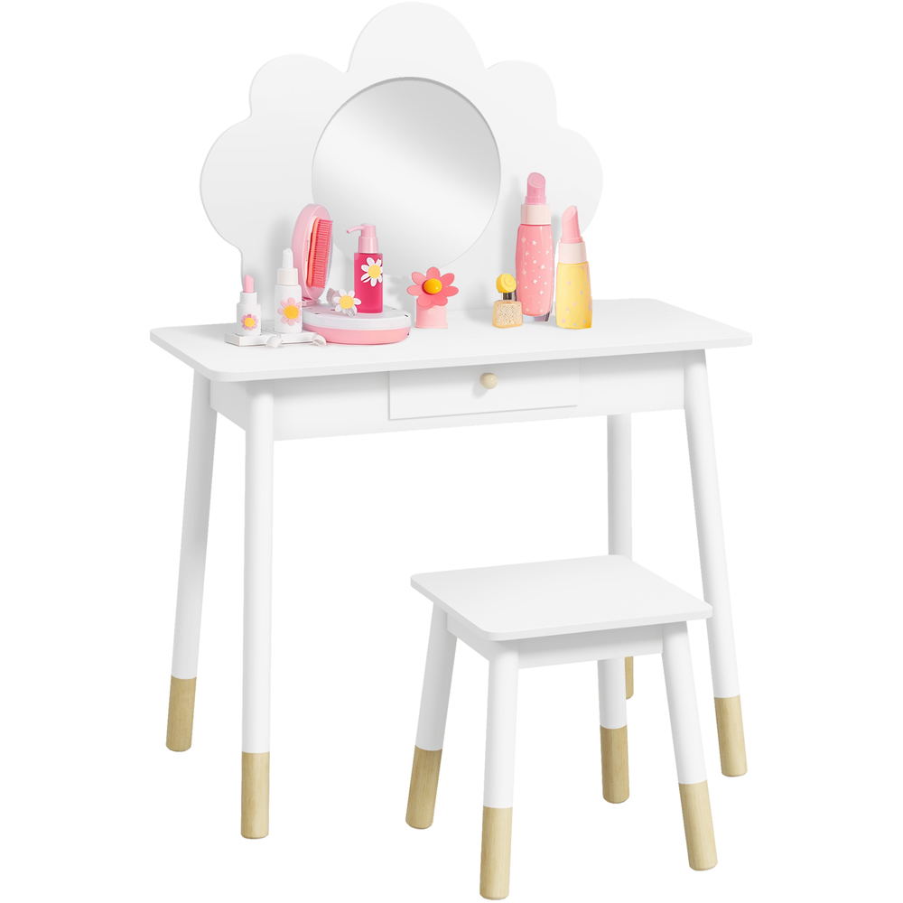 Enhance your child's room with the AIYAPLAY dressing table set, which includes a matching stool and a mirror, great for morning routines, pretend makeup sessions and playtime. Featuring a clean white look with a cloud-shaped mirror frame, it adds a stylish touch to any bedroom or playroom. The drawer provides storage for toys and other small items, helping to keep the room tidy and organised and no more clutter. Made from strong MDF, this set is smooth, stable and suitable for ages 3-6 years.