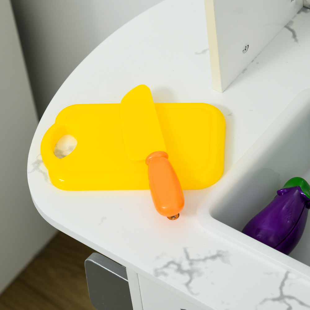 Introducing this AIYAPLAY toy kitchen, designed to bring delight and joy to all children. With realistic sound and light effects, pretend microwave, sink and washing machine, there's lots to keep kids engaged. There's even an apron and hat for the true chef experience. Whether it’s hosting dinner parties or making up roleplaying games, it encourages social play and endless creativity, making boredom a thing of the past. This toddler kitchen has realistic sound effects for the microwave, range hood and cooking knobs. It even has stove lights and an ice maker with ice cubes, creating an exciting play experience that sparks the imagination. Includes an apron and a matching chef's hat, making roleplaying games extra fun and believable. This kitchen also has a pot, pan, three utensils, pretend food, a cutting board and a dishcloth, so there is lots to play with. Made with robust MDF and moulded plastic components, this toy kitchen is safe and durable. It has been tested to relevant safety regulations, ensuring kids are safe when playing.