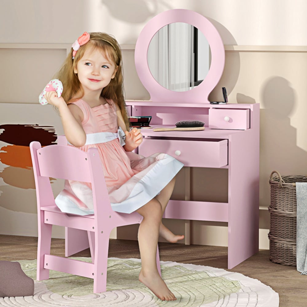 Transform playtime with the AIYAPLAY Kids Dressing Table. This delightful set features a charming vanity table with a crystal-clear oval mirror and four drawers to store all your little sweetie's makeup essentials. Crafted with child-safe MDF and smooth, rounded edges, it's the dream addition for any girls dressing table collection. Suitable for your little kids to glam up.