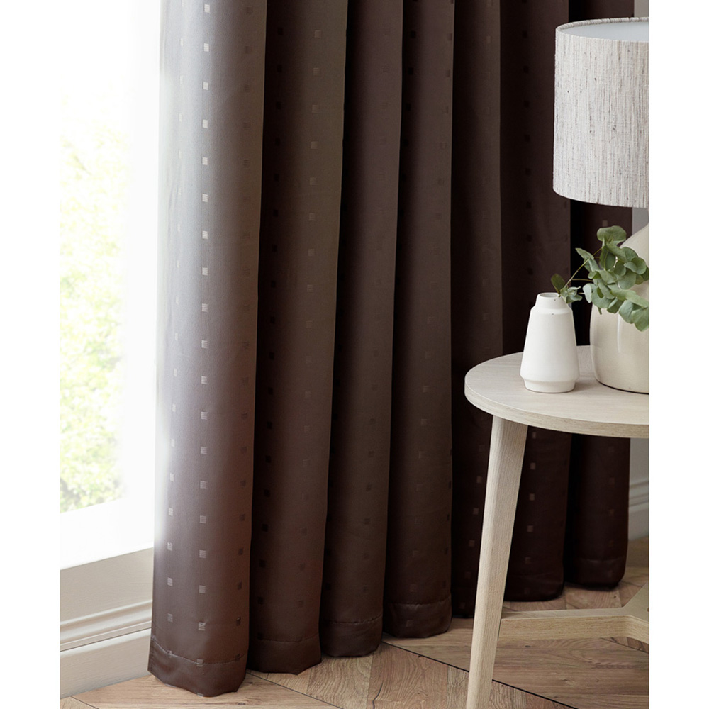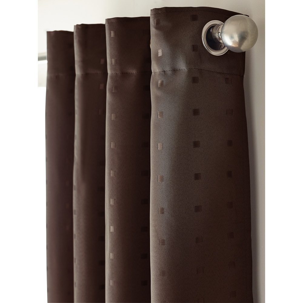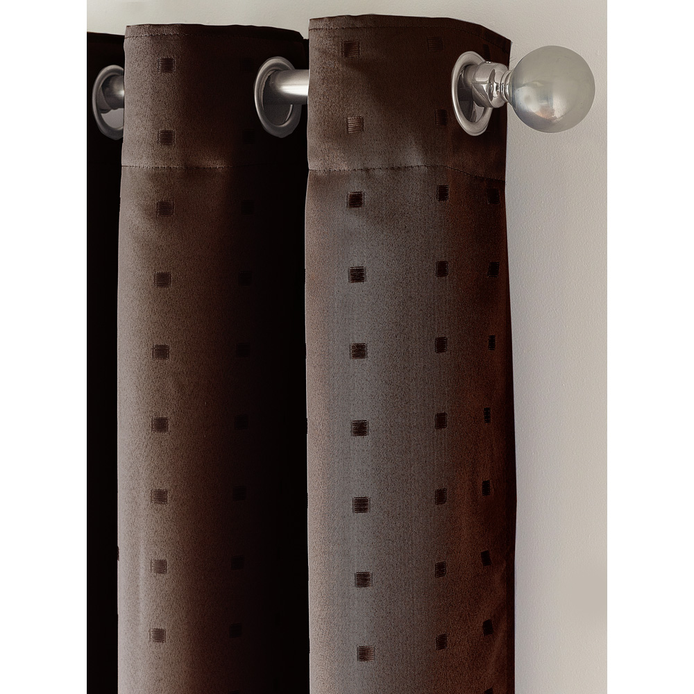 Elevate your living space into a luxurious retreat with the Alan Symonds Madison Chocolate Ring Top Curtain. The curtain exudes an ageless appeal that will add timeless beauty to your home. The heavy-weight poly-dobby fabric and contemporary eyelet heading make for an elegant and modern look. Made of 100% polyester, it is easy to maintain and can be machine-washed. The small woven square design adds sophistication to your space, reflecting your unique style and personality. Not only does the curtain enhance the ambience of your room, but it also helps regulate the temperature by providing insulation. The fully lined medium-weight drape keeps your space warm in winter and cool in summer. Let the curtain transform your space into a comfortable and stylish haven where you can relax and entertain guests in style. Size: 229 x 274cm.