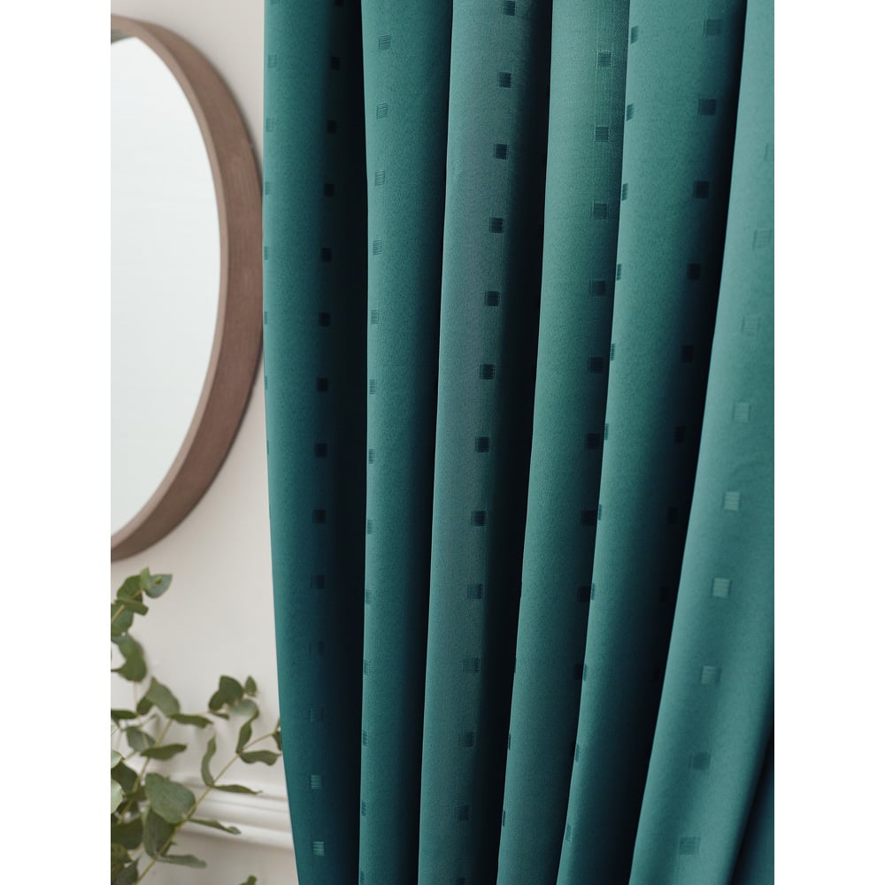 Elevate your living space into a luxurious retreat with the Alan Symonds Madison Teal Ring Top Curtain. The curtain exudes an ageless appeal that will add timeless beauty to your home. The heavy-weight poly-dobby fabric and contemporary eyelet heading make for an elegant and modern look. Made of 100% polyester, it is easy to maintain and can be machine-washed. The small woven square design adds sophistication to your space, reflecting your unique style and personality. Not only does the curtain enhance the ambience of your room, but it also helps regulate the temperature by providing insulation. The fully lined medium-weight drape keeps your space warm in winter and cool in summer. Let the curtain transform your space into a comfortable and stylish haven where you can relax and entertain guests in style. Size: 229 x 274cm.