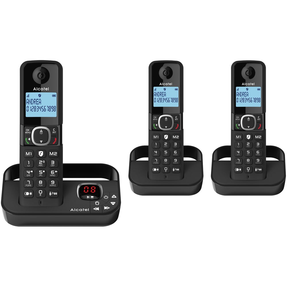 Introducing the Alcatel F860 DECT Phone with Answer Machine Trio, a versatile cordless DECT phone system designed to enhance communication. It comes with three sleek black handsets. With the smart Nuisance call block function, it can block up to 100 nuisance numbers using the dedicated key. The automatic mode allows only stored numbers to ring, ensuring uninterrupted calls from important contacts. Installation is easy, requiring only an electrical socket for additional handsets. Equipped with a 14-minute answering machine, managing messages is easy and convenient. Access keys on both the base and handset provide quick access to messages, while a message counter keeps you informed of new messages at a glance.