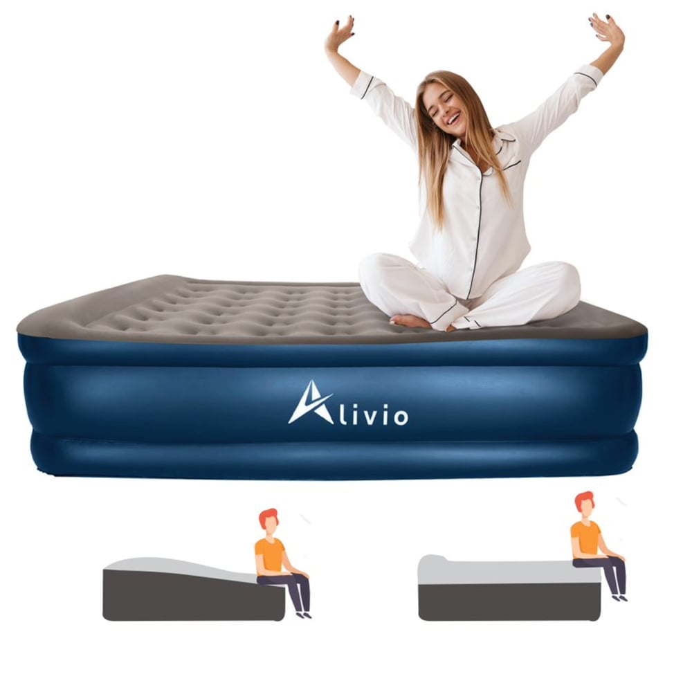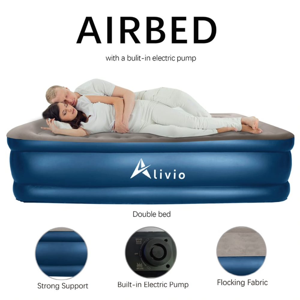 Relax and enjoy your leisure time with your friends with this Alivio Double Inflatable Air Bed with Built In Pump. This premium inflating, comfortable high-raised air bed is ideal for having a few friends over to stay the night. You can easily feel the difference between the double-layer base and the bulged outer frame, which stops you from rolling off the bed at night. It features a raised air mattress with outer perimeter construction for added stability.