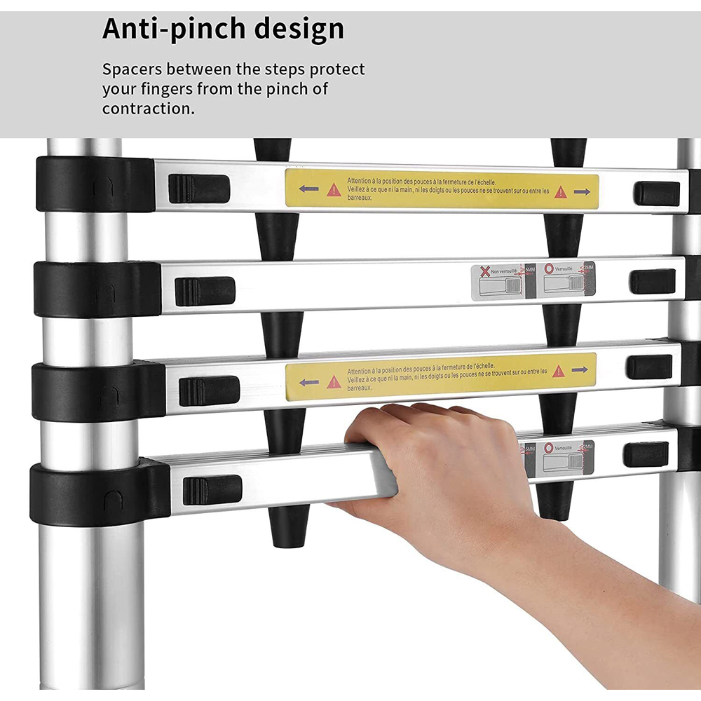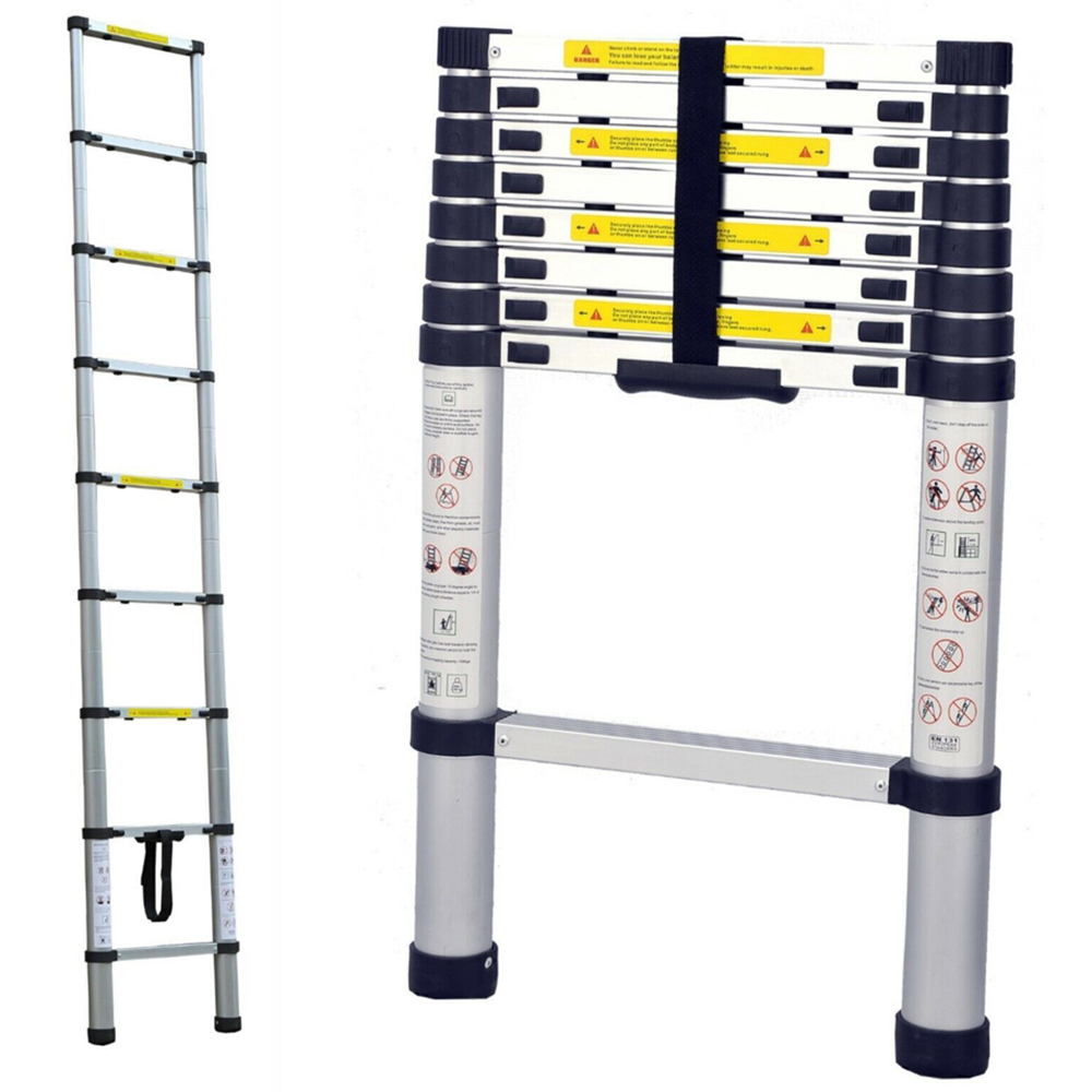 Elevate your reach and complete the task safely with the Alivio Silver Telescopic Ladder. This ladder is engineered to provide a versatile solution for various tasks, making it an ideal addition to your toolkit. It is crafted using sturdy, high-quality aluminium for durability and longevity. This telescopic ladder is designed for ultimate convenience and effortlessly retracts to a quarter of its height. It features a classic design with an extendable and collapsible step mechanism. This ladder has a portable design that folds down to a convenient size when not in use, ensuring effortless storage and easy transportation. It features a heavy-duty strap that secures the ladder in its closed position, allowing for hassle-free storage and transportation. This ladder is meticulously engineered for safe opening and closing, which prevents any finger-related injuries. This portable ladder serves as a reliable companion for your tasks, offering a secure and stable platform with non-slip caps at the base that hold it firmly in place during use, enhancing overall safety while working. This telescopic ladder has an extendable height of 3.2m (10.5ft). It folds down to a compact size of 0.77m (2.5ft) when not in use.