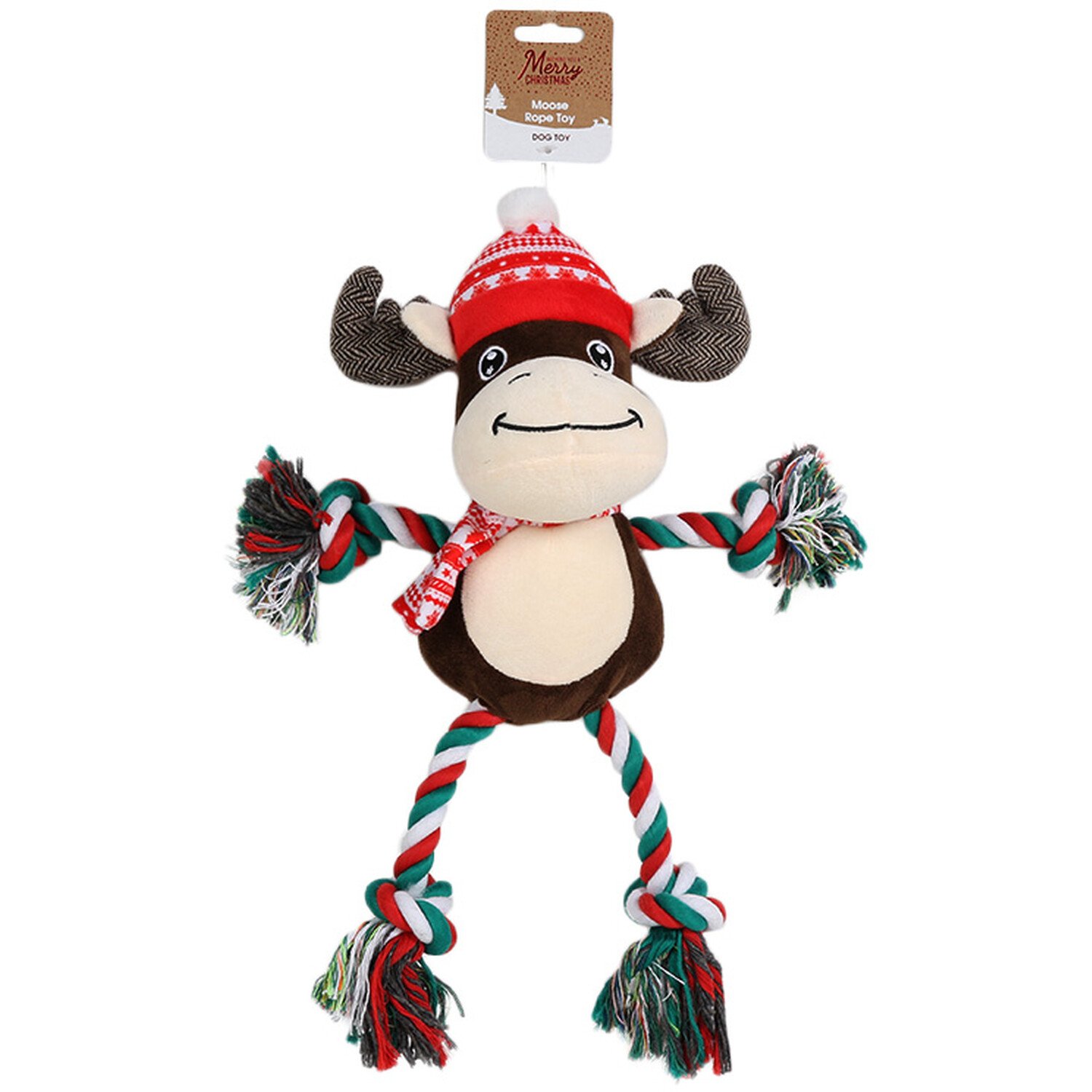 Featuring a cute moose design, this Moose Rope Toy is the perfect gift for your pooch this Christmas. The Moose has strong rope limbs dyed in the classic festive colours of red, white, and green - giving it an extra Christmassy feel! With an integrated squeaker, the sound helps to encourage play.