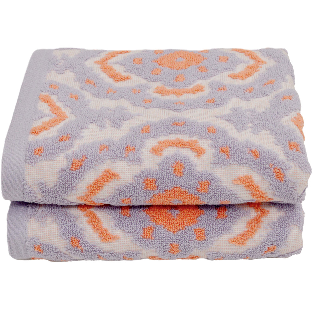Treat your bathroom to elegance with the Luxury Goa Sculpted Hand Towels. Crafted from 100% cotton for superior softness, these ikat lilac patterned towels will add a premium touch to your bathroom routine. Wrap yourself up in super soft luxury when you step out from the shower, then hang your towel to dry with the sewn-in hanging loops, for quick drying and ease of storage. These striking towels feature a unique sculpted design in an eye-catching coral and lilac pattern. Brighten your bathroom decor with a stylish touch, and let these towels provide the perfect statement piece when not in use.