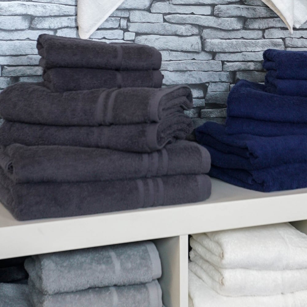 Add style to your bathroom decor with this Hotel Essentials Towel Bale. This essential towel bundle is made from ring spun cotton that is absorbent and quick to dry. Woven to offer super softness, durability and absorbency with its 450gsm weight, this bale has a stylish woven border and edging at both ends. The six pack towel bundle consists of two face cloths, two hand towels and two bath towels. This perfect assortment has everything you'd require to complete your bathroom routine with a luxurious touch. Wrapped with a satin ribbon for the final flourish, this bundle makes for a perfect gift for new homeowners or university starters.