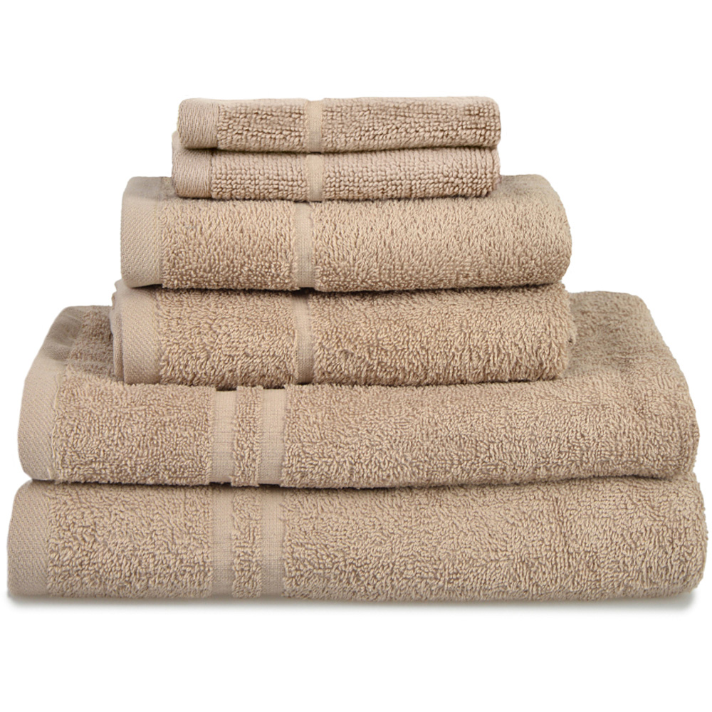 Add style to your bathroom decor with this Hotel Essentials Towel Bale. This essential towel bundle is made from ring spun cotton that is absorbent and quick to dry. Woven to offer super softness, durability and absorbency with its 450gsm weight, this bale has a stylish woven border and edging at both ends. The six pack towel bundle consists of two face cloths, two hand towels and two bath towels. This perfect assortment has everything you'd require to complete your bathroom routine with a luxurious touch. Wrapped with a satin ribbon for the final flourish, this bundle makes for a perfect gift for new homeowners or university starters.