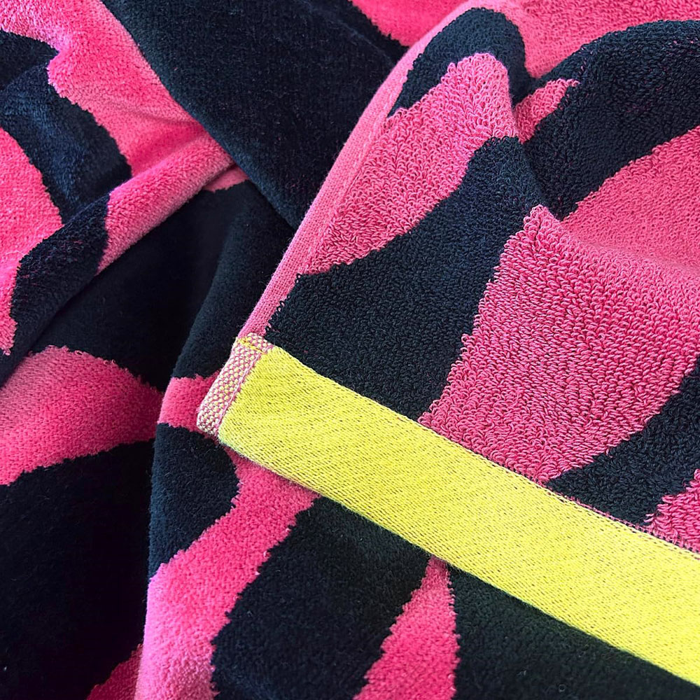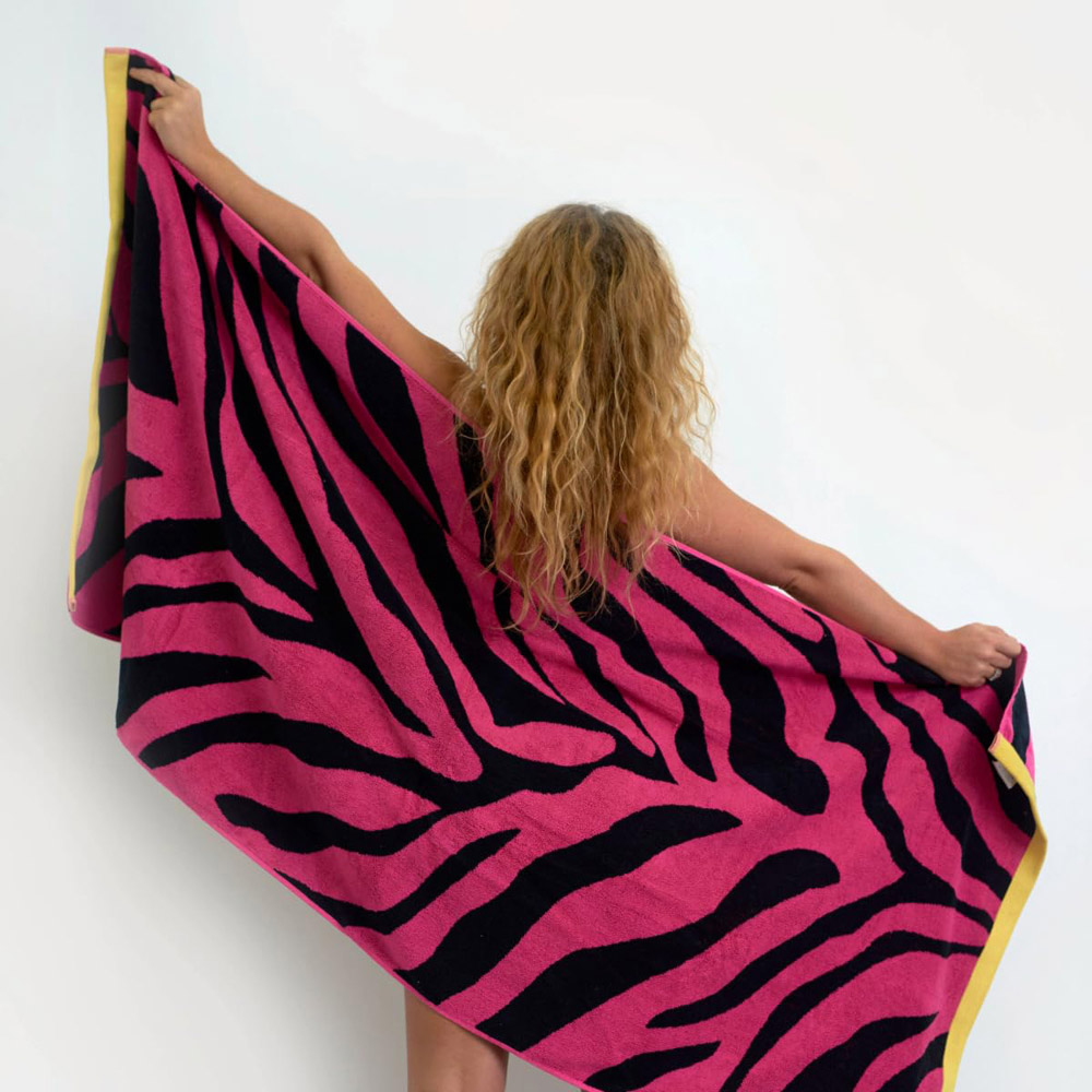 Leave the fear of losing your beach towel on a busy beach behind as this bold animal patterned towel will catch your eyes from afar. In a striking hot pink colour with Zebra Print stripes, this beach towel is a fun choice to throw in your beach bag. Crafted from 100% Cotton, this towel is delightfully soft, making it perfect for delicate skin, drying you off quickly and gently. A velour finish is on one side, offering supreme softness, and terry cloth on the other side, for maximum absorbency. The towel itself will also be quick to dry, so you don’t have to worry about carrying heavy damp towels in your bag. Measuring a generous size of 80 x 180cm, this Zebra towel gives you more space to lie on at the beach. Better still, this towel can be extremely versatile, and can also perfect for the poolside, camping trips and festivals.