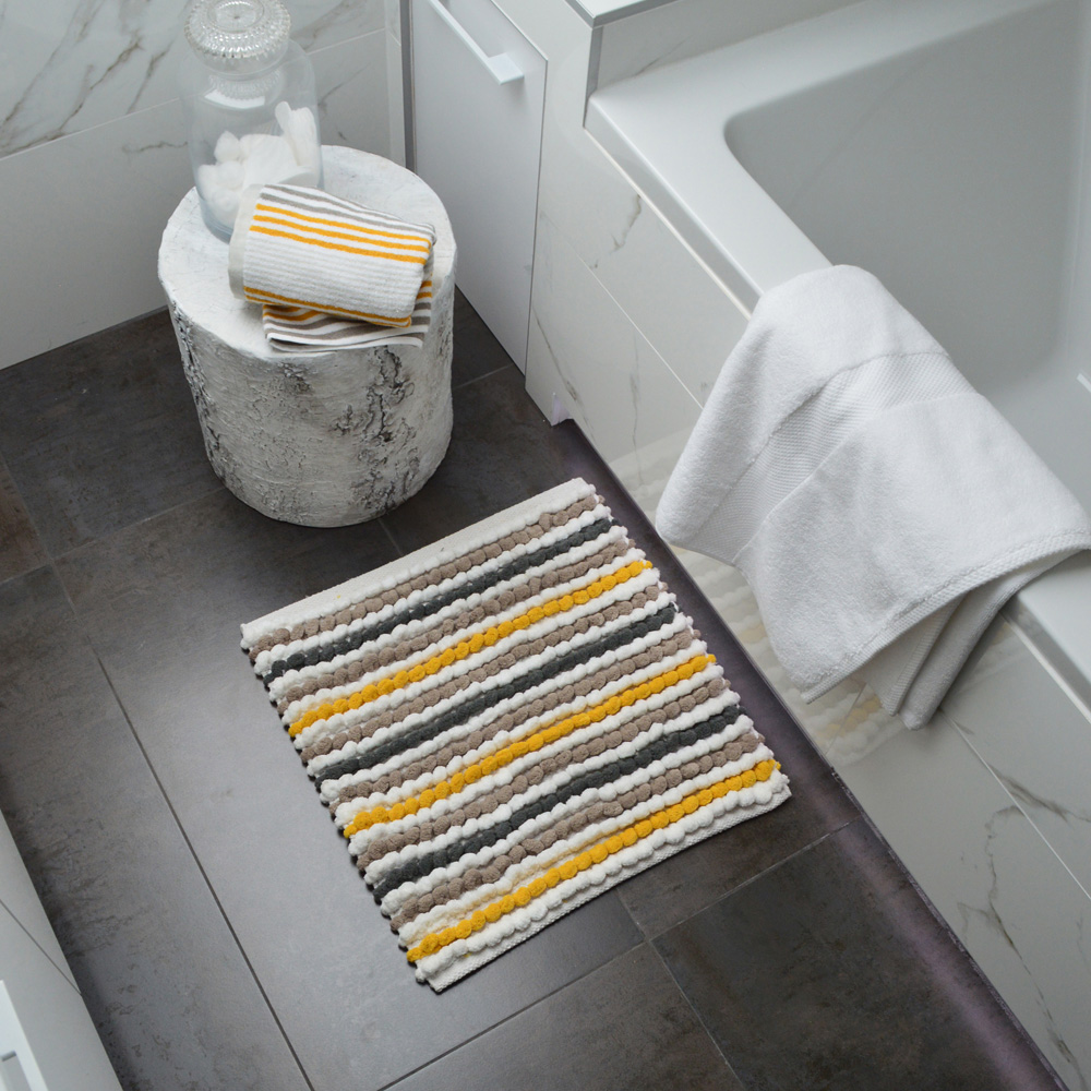 This luxurious chunky bobble square bath mat is designed to enhance your shower experience while adding a touch of elegance to your bathroom decor. Hand-woven with care, this shower mat features a soft and plush microfibre polyester pile that feels incredibly comfortable under your feet. The microfibre material not only provides a cosy and warm sensation but also offers excellent water absorption to keep your bathroom floor dry and safe. Being quick drying and easy care, this shower mat is perfect for those with busy bathrooms! The striking striped design adds a modern and eye-catching element to your bathroom decor, designed to create a vibrant and inviting atmosphere. Use beside the bathtub or outside the shower, and treat your feet every single time your step out.