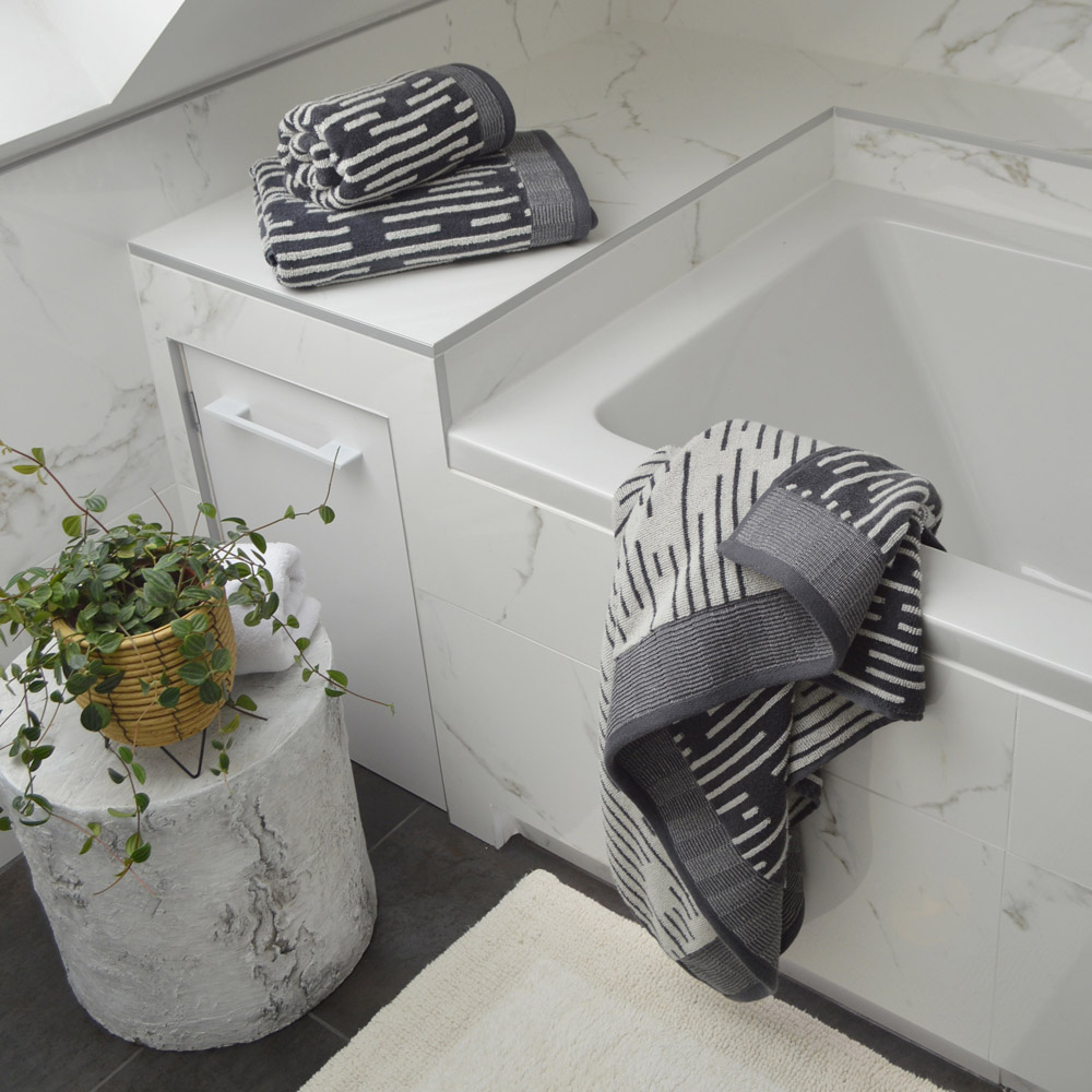 Crafted from luxuriously soft cotton, these barcode striped bath towels offer a blend of modern style and functionality. With each stripe crafted using pop up zero twist construction, these textured towels have a long, bouncy loops, which create an extra plush feeling, perfect for those with sensitive skin. The trendy barcode stripe design adds a contemporary touch to any bathroom, while the super-soft, absorbent & quick-drying fabric ensures a spa-like experience every time. Utilise the sewn in hanging loop after use, perfect for ease of storage and to speed up the towel's drying time even further.