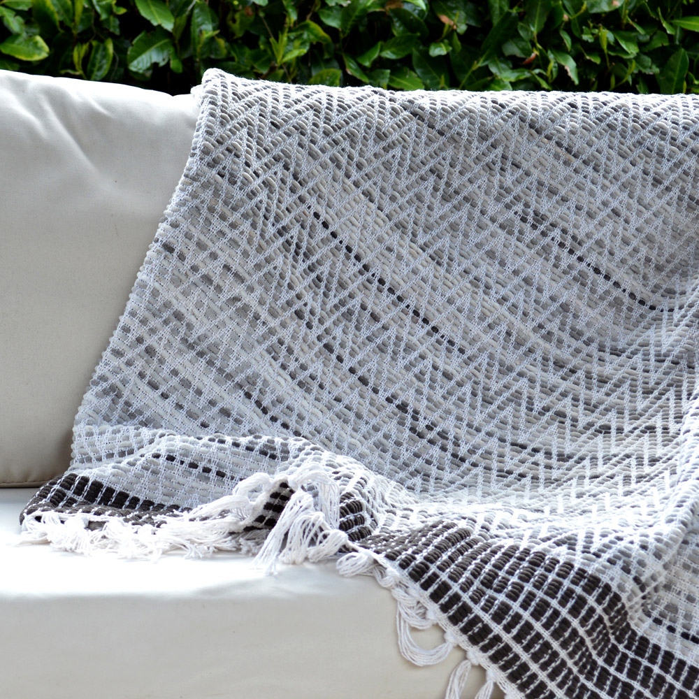 This herringbone throw is crafted using space-dyeing to provide a beautifully coloured throw which will make a stylish statement in your home. Made with sustainability in mind using a blend of recycled cotton and polyester, this patterned throw ensures ultimate softness, making it ideal for cosying up on the couch during chilly evenings or to use as a garden throw on a summers evening. The combination of cotton and polyester guarantees durability, allowing you to enjoy its beauty and functionality for years to come. This decorative throw features a tasteful tasselled fringe, giving it distinct character and visual appeal. The fringe not only enhances its aesthetic charm but also lends a luxuriously soft feel to the overall design. Experience the cosy embrace of this Zig Zag Design Throw and infuse your living space with sophistication, style, and comfort. Being ribbon tied, it also makes for a thoughtful gift for friends and family.