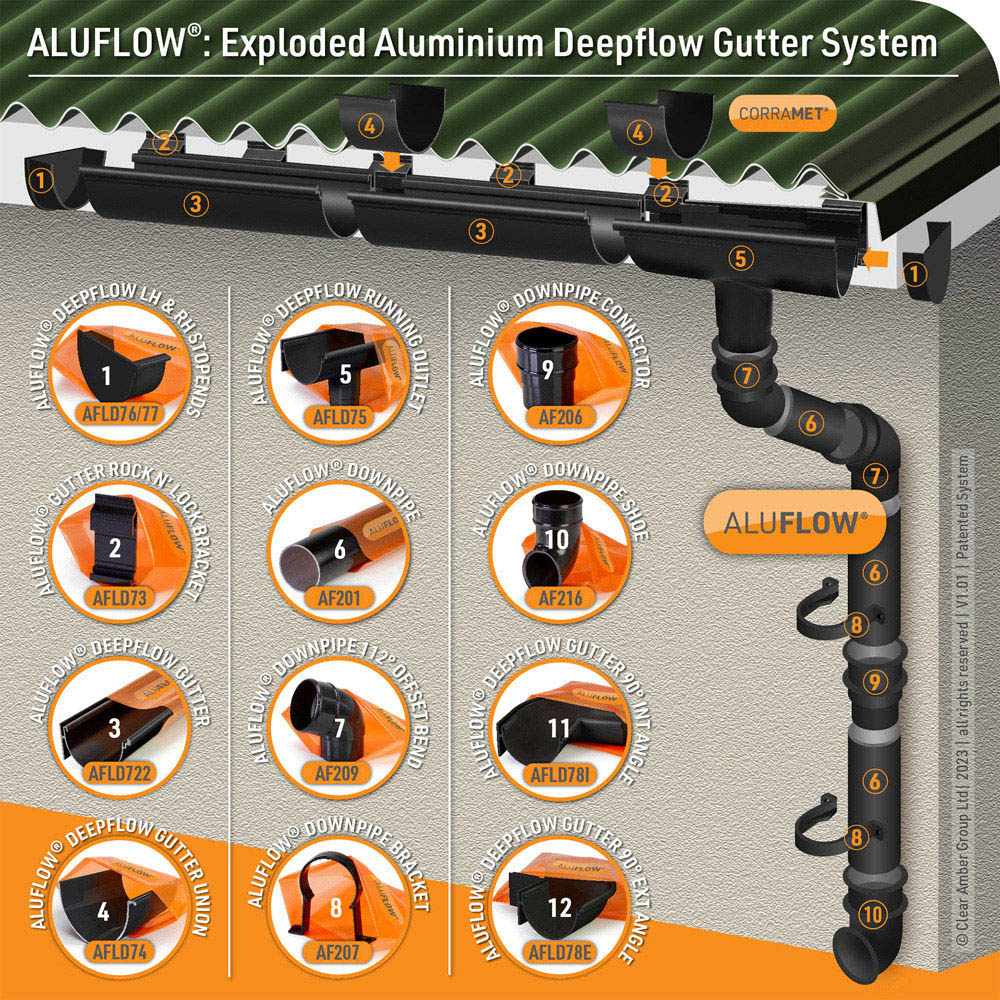 The Aluflow Black 90 Degrees Deep Internal Gutter Angle is specifically designed to connect two sections of aluminium guttering at a corner. This particular gutter corner is ideal for external corners found on residential homes and other structures. The deep flow design of this angle allows for excellent drainage capacity and is compatible with the rest of the Aluflow system, which is patented. Made from durable aluminium, this gutter angle ensures long-lasting performance once installed. To properly seal and secure the gutter to the Aluflow angle, a union is required on both sides. This gutter angle boasts a classy curved design and is perfect for 90 degree external corners.
