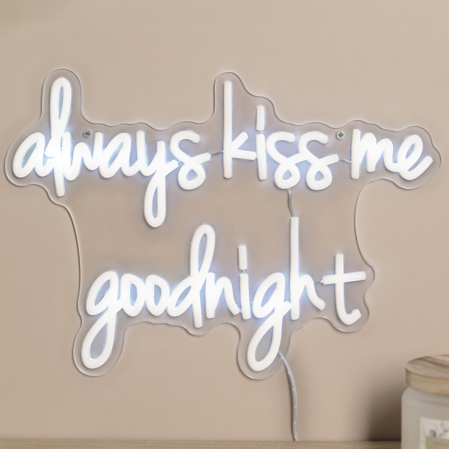 Add a fun and flirtatious charm to your space with the Always Kiss Me Goodnight Neon Sign. This stylish sign features a trendy neon-inspired design with a bright white glow and a bold red kiss mark, making it the perfect way to add a funky and cheeky atmosphere to any room. Whether you're looking to add some personality to your bedroom, living room, or home office, this sign is sure to make a statement and spread the love.