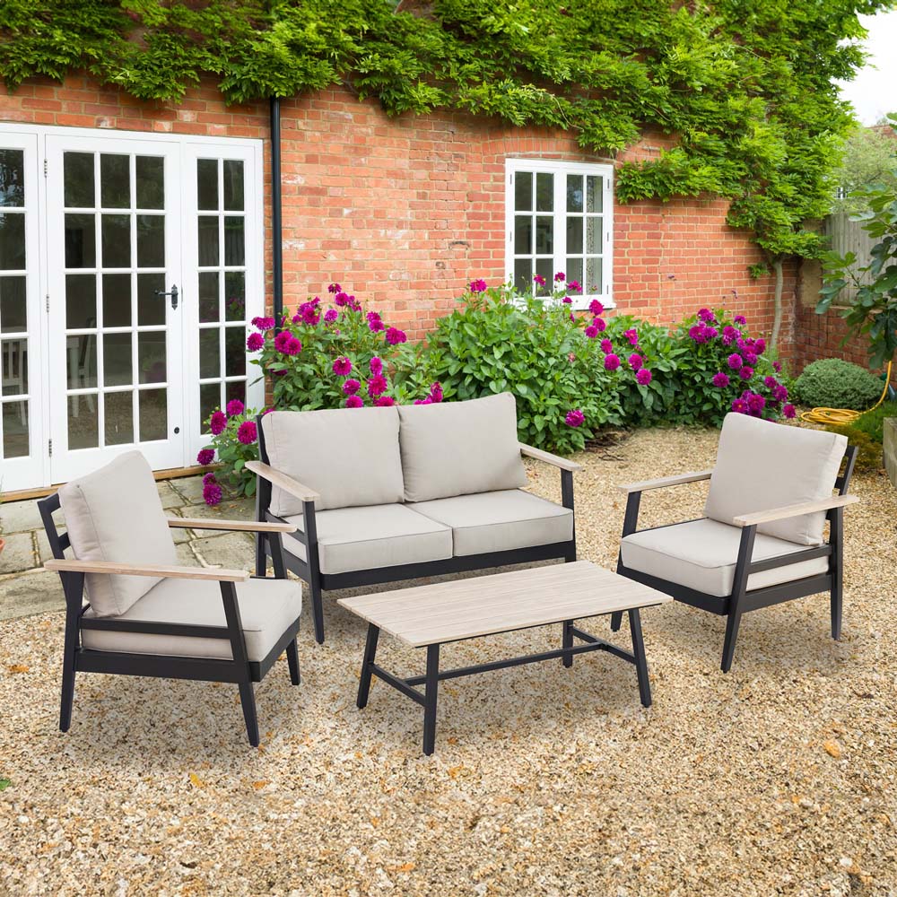 Upgrade your outdoor area with the Amaya 4 Seater Grey Outdoor Sofa Set. This garden relaxation addition features a sleek, minimalist design crafted from durable powder-coated aluminium. It includes a practical coffee table with a heat transfer tabletop for placing snacks, drinks, or decorative items. This stylish and comfortable seating arrangement accommodates up to four people, making it the perfect choice for family gatherings or friendly gatherings.