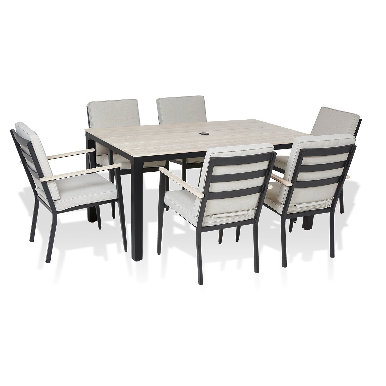Complete your dining room setting with this Amaya 6 Seater Dining Set in grey. Including a rectangular table and six matching chairs, each piece features a powder-coated aluminium frame as a strong base. The table is a heat-transfer tabletop to offer a helping hand while serving. While the fluffy cushions on the chairs make them perfect for a comfy dining experience. Simple yet elegant, it's perfect for gathering with friends and family for a great spread.