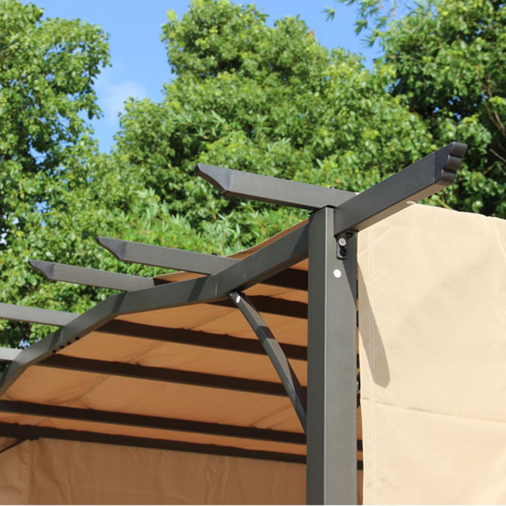 Create a beautiful garden feature with San Remo Pergola Gazebo 2.75 x 3.66m Mocha. It can be used for ample shade or shelter for a garden party or barbecue. Manufactured from high-quality material - you can leave the structure out in all weathers. Note: It is recommended to close the canopy when there is extreme weather such as rain and high winds. Wipe clean only. Do not iron. Do not tumble dry. H240cm x W366cm x L275cm.