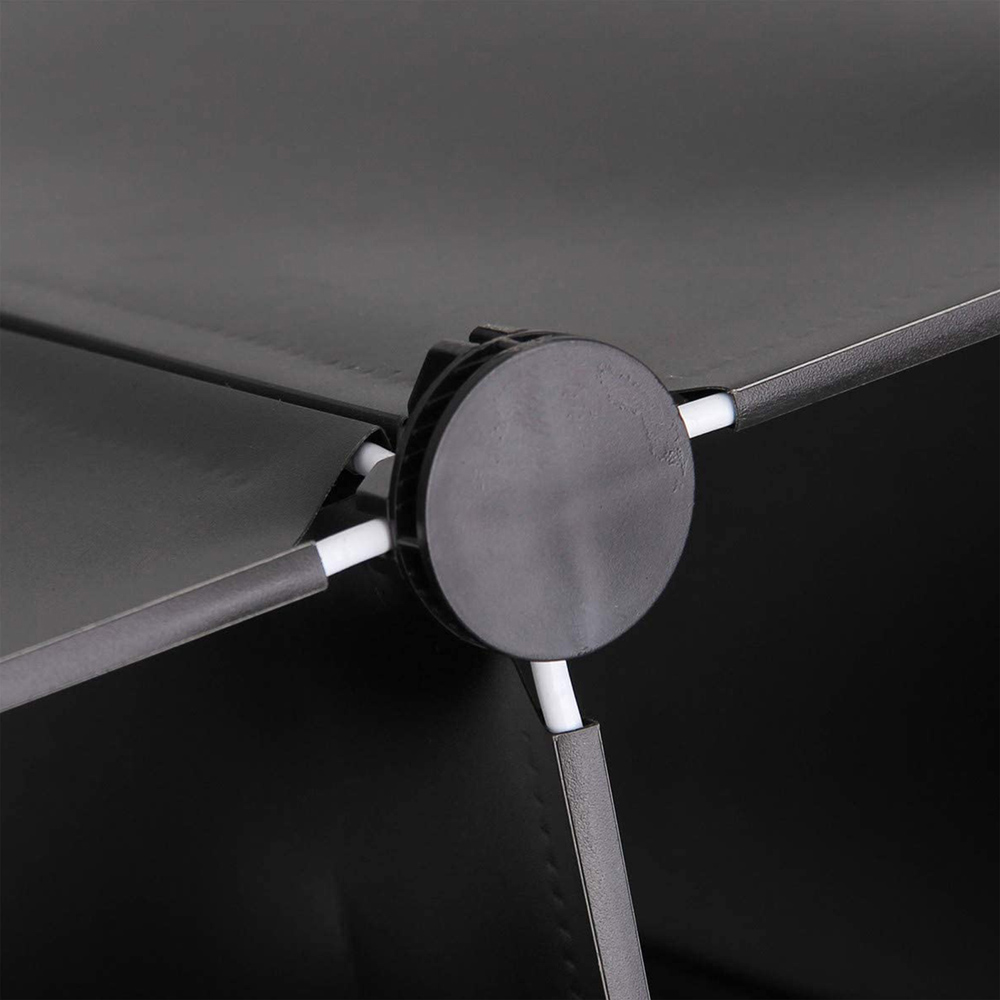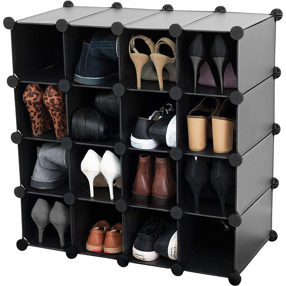 Organise your shoes stylishly with the AMOS 16 Pair Interlocking Cube Shoe Storage Rack in black. This space-saving solution allows you to store and display multiple pairs of shoes, from snug flats to bulky boots. Its versatile design makes it perfect for any spot in your home – be it the corridor, under the stairs, or in the wardrobe. With 16 fully modular, interlocking cubes, each measuring 22 x 22 x 35cm, you can customize the size and shape to fit your needs. Even better, you can add more cubes for extra space. This multi-purpose unit isn't just for shoes; it's great for clothes, toys, and more. Made of durable ABS plastic and metal, these cubes are dust and water-resistant, keeping your belongings safe. Plus, assembly is a breeze with the included mallet and instructions, and the lightweight design makes it easy to move. Cleaning is simple too – just wipe with a damp cloth. Perfect for a tidy, organised home.