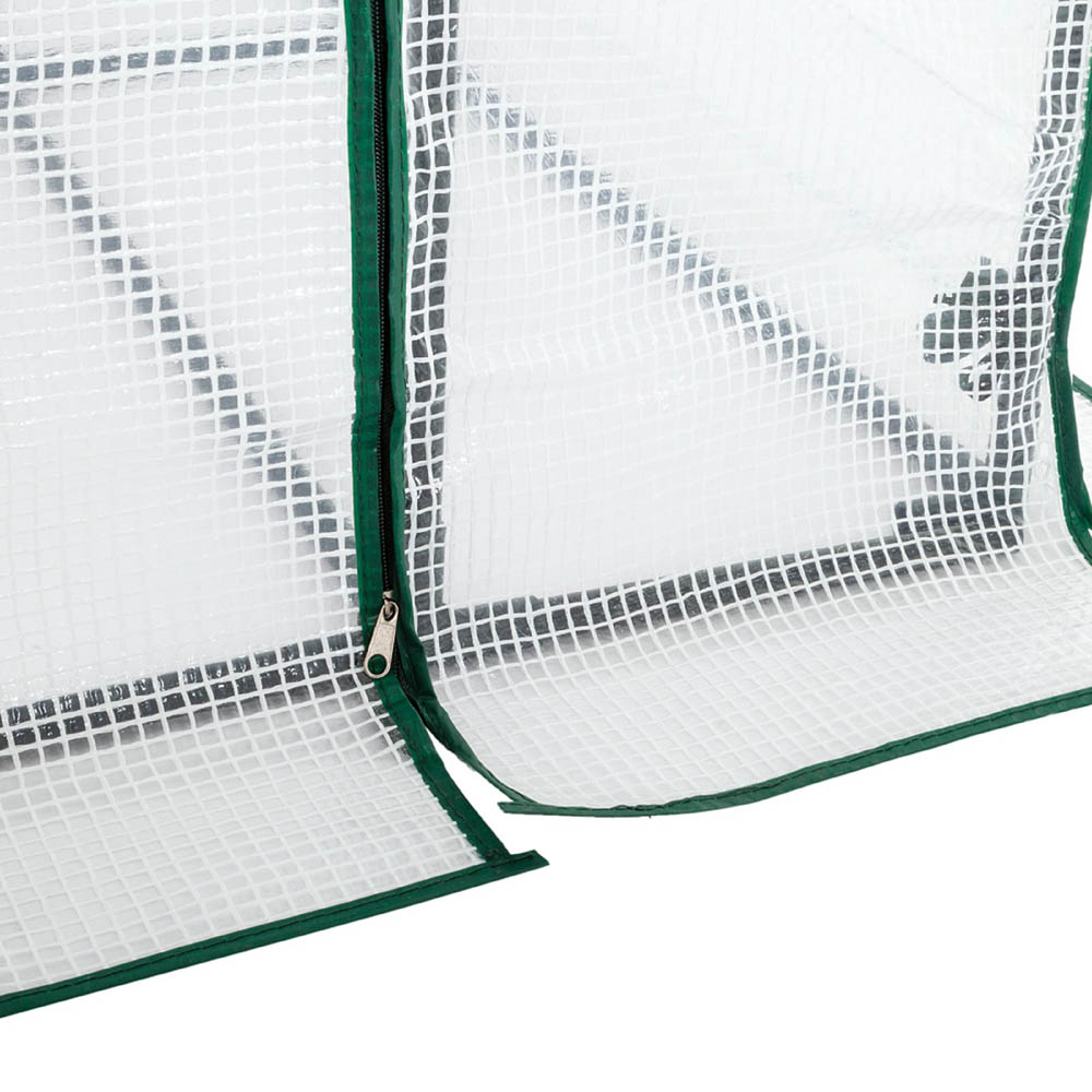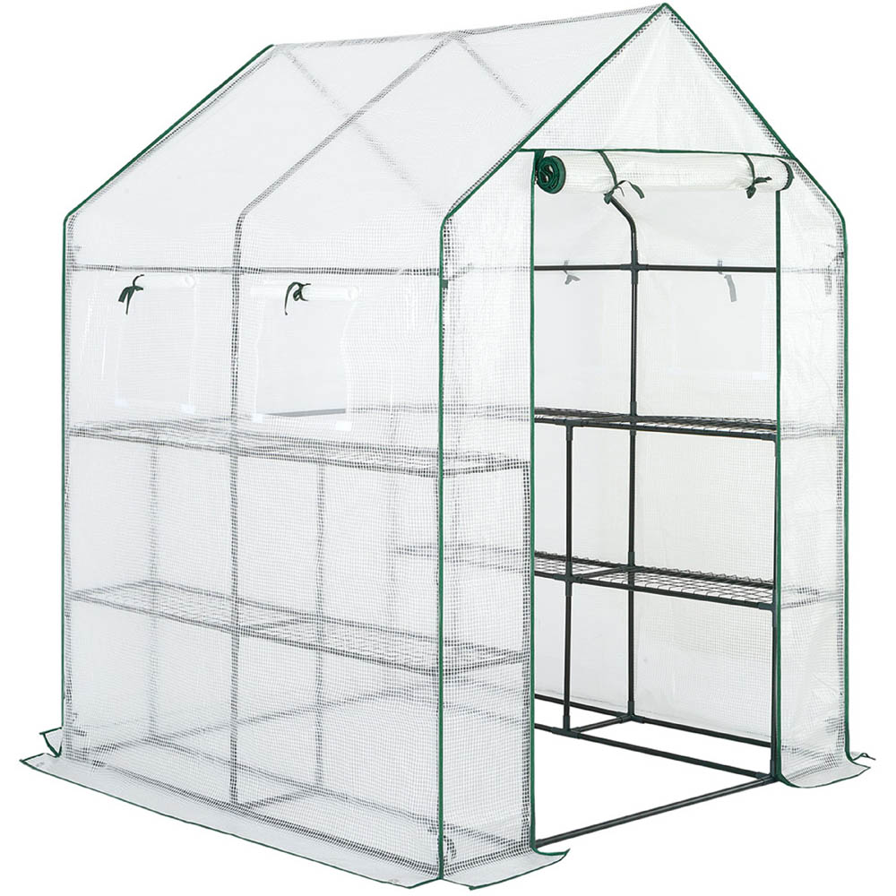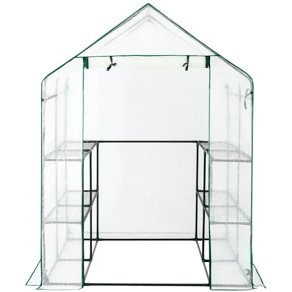 The AMOS 3-Tier Portable Outdoor Garden Patio Walk-In Greenhouse is a great solution for gardening enthusiasts who want to create an ideal space for raising seeds, cultivating plants, and protecting them from frost, cold, and pests. The greenhouse has a stable and sturdy frame made of 16mm powder-coated metal tubes, which ensures durability and longevity. It also features eight strong removable wire shelves and a waterproof PE cover, making it easy to assemble, compact for various outdoor spaces, and designed to extend the growing season. The greenhouse is perfect for versatile outdoor gardening and can elevate your gardening experience. The assembled greenhouse measures H195 x W143 x D143cm, while the shelf dimensions are W70 x D29.5cm, and the space between shelves is 44cm (H). The greenhouse is white and has a high-quality PE fabric cover that provides insect protection, UV resistance, and balanced shade.