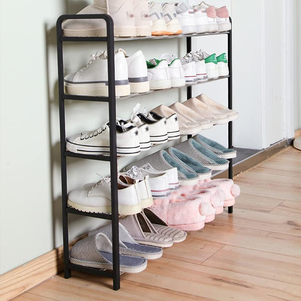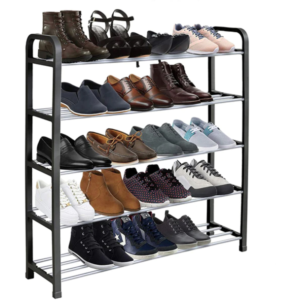 Keep your shoes neatly organised with the AMOS Eezy 5-Tier Black and Silver Metal Shoe Rack. Built to last, this practical organiser features a strong plastic frame and metal pole shelves. Its durable construction resists bending and warping, ensuring it can hold your shoe collection securely. Also, the rack's compact dimensions make it an ideal space-saving solution for any hallway, living room, or bedroom. Plus, it's capable of accommodating approximately 20 pairs of shoes, offering ample storage space. Putting this rack together is a breeze, with no tools required for assembly, allowing for a quick and hassle-free setup. Beyond shoes, this versatile rack can also be used for organising various other items, making it a handy addition to any room in your home. Lastly, its black and silver colour combination easily fits in any decor style.