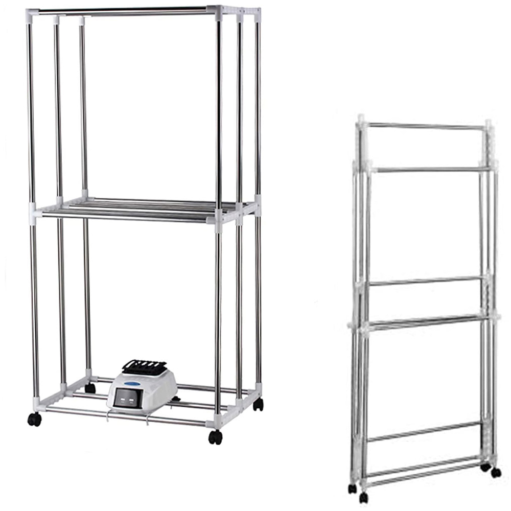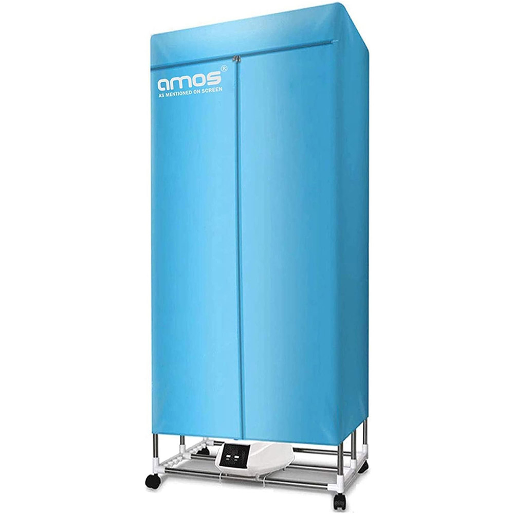 Discover the AMOS Eezy-Dry Electric Clothes Dryer, a lifesaver for indoor laundry drying. The dryer is perfect for those days when the weather won't cooperate or when you've got a mountain of clothes to dry. Sturdy and solid, it can handle up to 15kg of damp clothing, that's about 25 items. Also, with the option to add extra bars, you can even fit up to 50 smaller items. The warm air from its 1300W motor dries clothes effectively, mimicking the fresh air of outdoor drying but much quicker and more cost-efficient than a tumble dryer. Easy to use, just hang your clothes on hangers inside the dryer, zip it up, and set the timer. You can choose drying times from 20 to 240 minutes, either on the machine or with the handy remote control. Easy to move, it's lightweight and a breeze to move around your home, thanks to its sturdy, non-corroding build and castor wheels. Plus, cleaning is simple and when not in use, it folds flat for easy storage. Please note: Hangers and clothes are only for representative purposes.