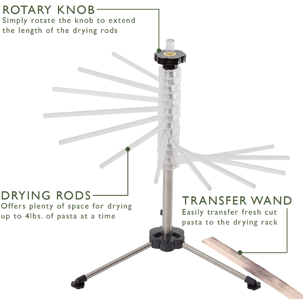 Homemade pasta night just got a whole lot easier with this AMOS Spiral Pasta Drying Rack. This stand is a nifty kitchen helper for all the homemade pasta lovers out there. It is a real space-saver with 16 extendable drying rods, each measuring 7.9 inches. You can dry up to 2.5kgs of pasta at once - that's about 4lbs, ideal for large batches of spaghetti, and noodles. Featuring a clever design, a simple twist of the rotary knob extends the rods, making it easy to set up and take down. Also, it comes with a handy pasta transfer wand, making moving your pasta from pot to rack a doddle. Plus, when you're done, it folds away neatly, waiting for your next pasta-making session.