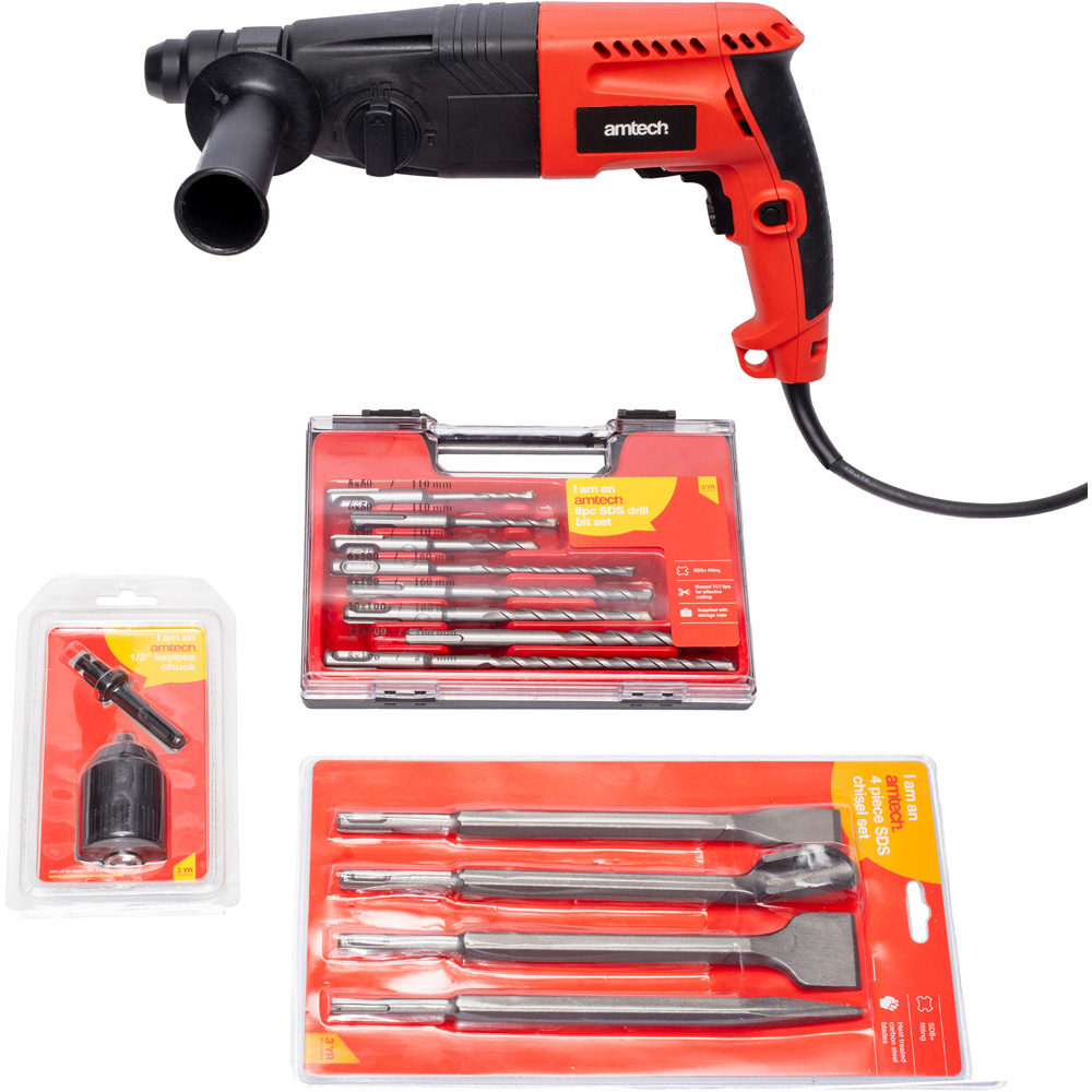 Designed for heavy-duty DIY tasks, this rotary hammer drill boasts a powerful motor and multiple modes, including drill, hammer, and roto-stop. It comes with an adapter, assorted drill bits, and chisels for maximum functionality.