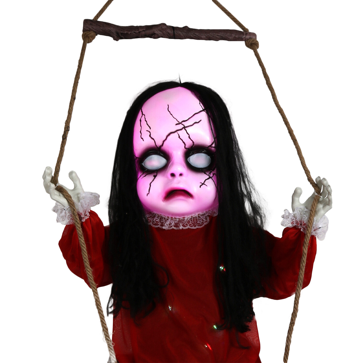 The perfect spooky decoration for your home this Halloween, this Animated Swinging Girl is sure to set the tone. Certain to spook your Halloween party guests and trick-or-treaters, this creepy girl is perched on her swing, sure to frighten anyone who passes her. This decoration is battery-operated so you can place it wherever you'd most like to terrify your unsuspecting guests!