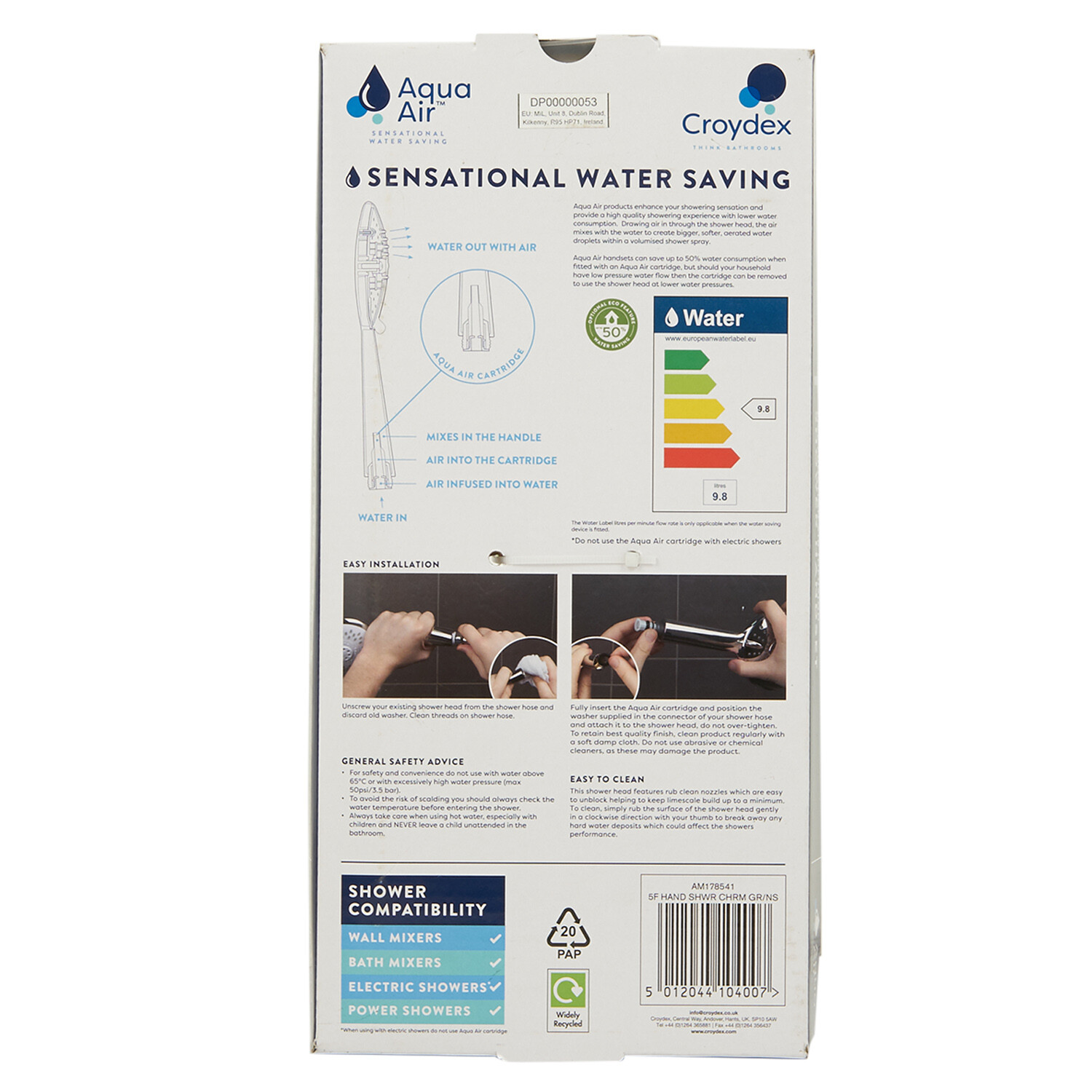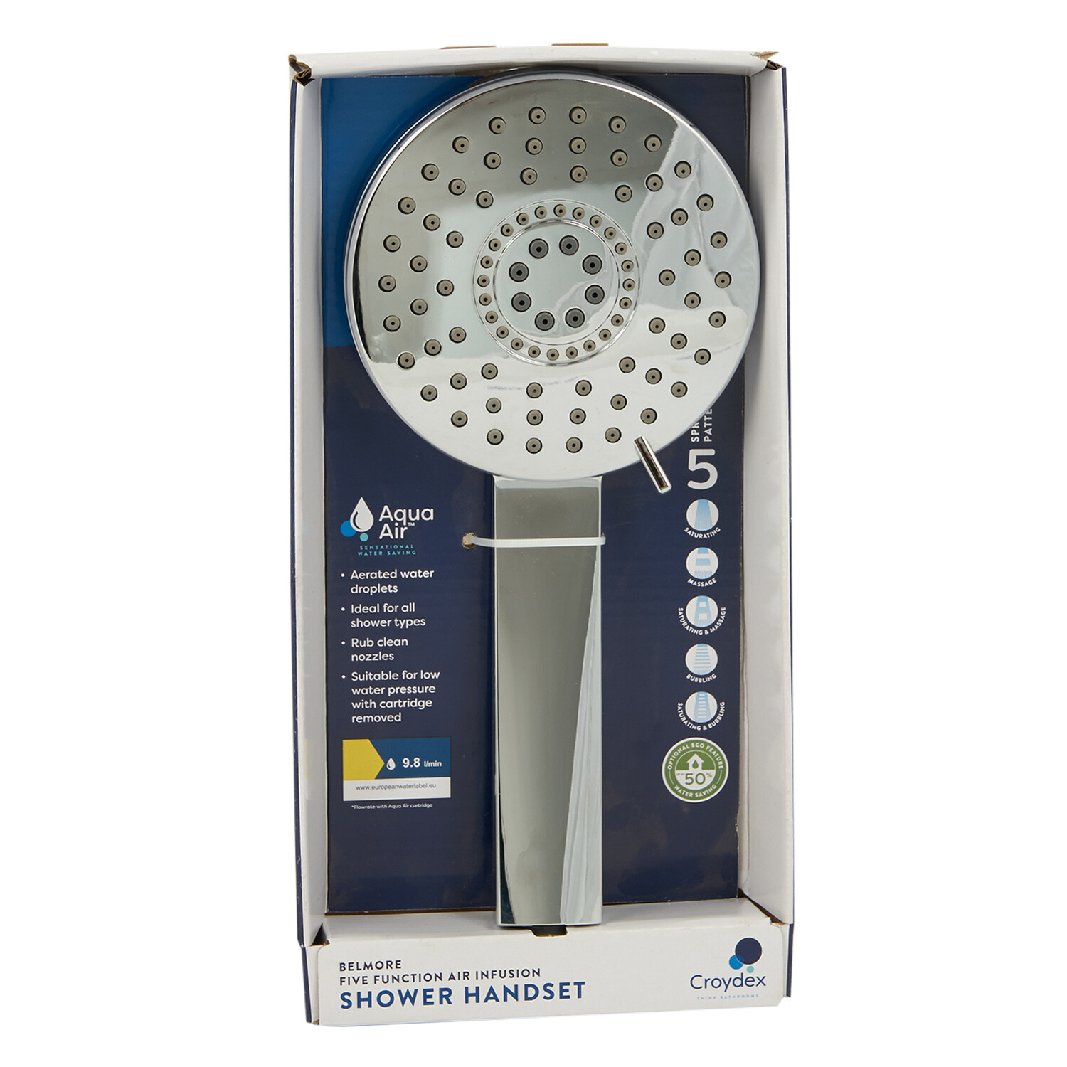 Get a luxurious and customisable shower experience with the Aqua Air Belmore 5 Function Shower Head Chrome. With five spray settings, you can choose the perfect flow to suit your mood. Crafted with a gorgeous chrome finish, it adds a touch of elegance to any bathroom. Featuring Aqua Air technology, it helps you save water without compromising on performance, delivering a powerful and efficient shower every time.