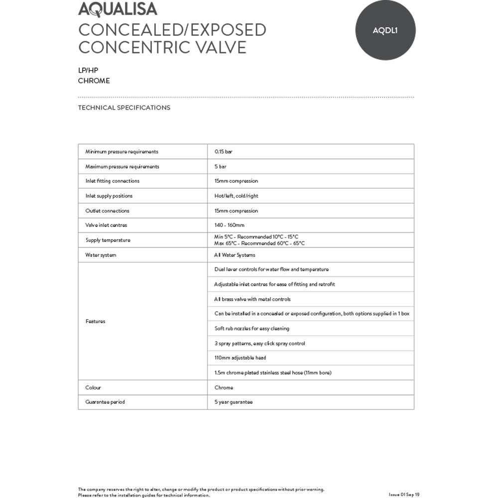 The Aqualisa Concentric Thermostatic Exposed/Concealed Kit comes in a sleek contemporary style that will compliment any bathroom suite. This Kit contains a both an exposed and concealed single outlet thermostatic valve, a slimline wall-plate, an adjustable rail, a round three-mode shower handset, and a 1.5m hose, all in a gloss chrome finish. Compatible with gravity, boosted gravity, combi and balanced high pressure water systems.