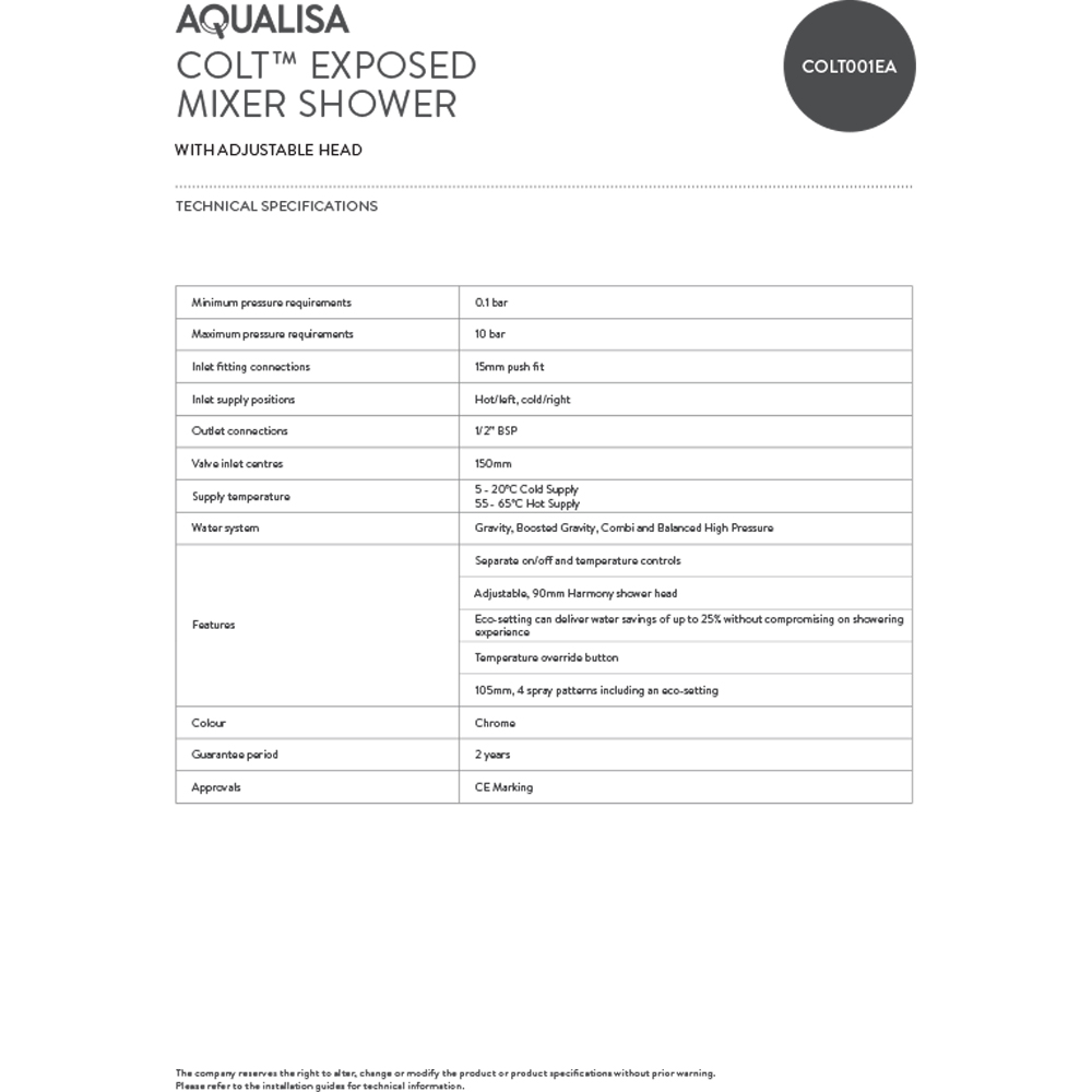 The Aqualisa Colt uses Aqualisa's unique thermostatic technology, guaranteed to provide excellent flow rates, even on gravity fed systems. Safe, affordable, high performance showering, whatever the water system. The Aqualisa Colt comes complete with a 90mm adjustable height shower head, with four invigorating spray patterns, part of Aqualisa's new Harmony shower head range. Aqualisa's unique thermostatic technology.
