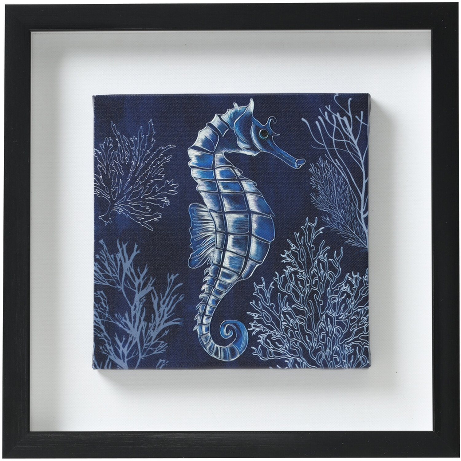 Perfect for those who love the coastal vibe, this Aquatic Navy Giclee Framed Art will be the ideal finishing touch to your home. The frame comes in one of two designs: a seahorse or a jellyfish. Each print has a highly detailed design and is accented with sea plants, all in a deep navy tone inspired by the deep sea. It comes ready framed and is quick and easy to hang via the hooks on the back.
