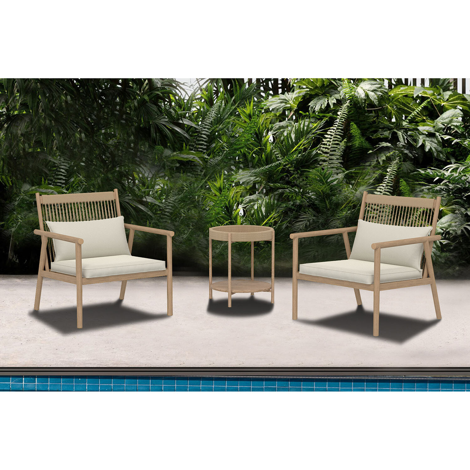The Arabella Bistro Set combines style and practicality to elevate any outdoor space. Whether placed on your patio, balcony or in your garden, this set provides a chic and comfortable environment for relaxation. Its robust steel frame offers lasting durability, while the sleek wood-effect finish enhances its visual appeal. Wrapped in high-quality PE wicker rope, the set is both fashionable and weather-resistant. The cushions for the seat and back offer cosy support, making your outdoor moments even more enjoyable. The set also includes a trendy two-tier side table with a matching wicker design, perfect for drinks, snacks, or decorative accents. Ideal for small gatherings or peaceful solo time, the Arabella Bistro Set is a stylish and durable addition to your outdoor living space.