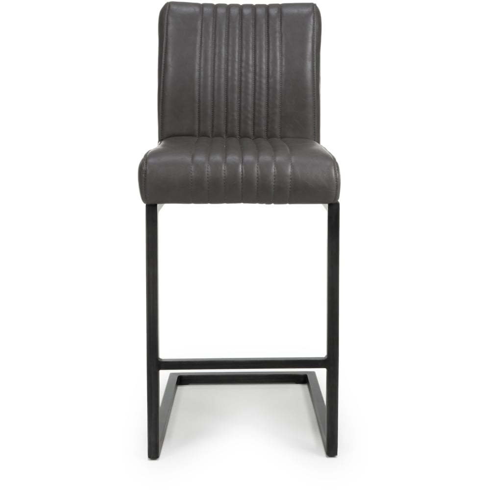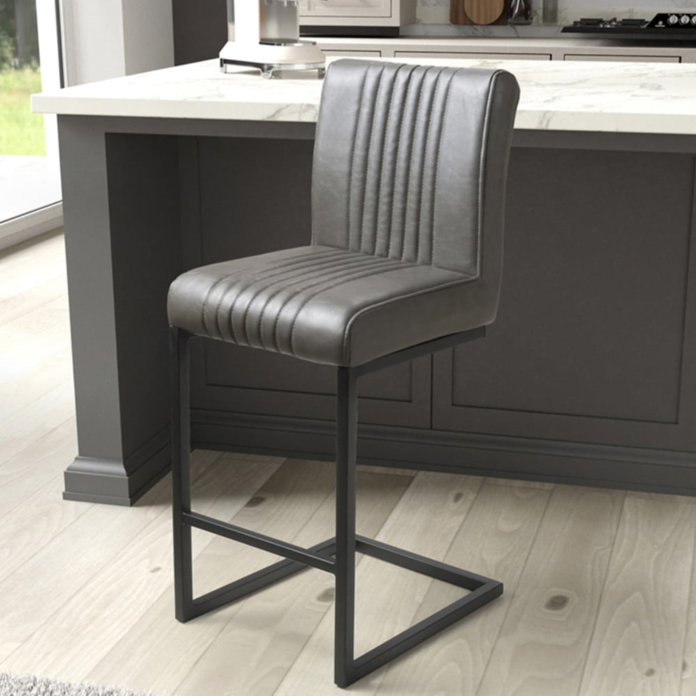 Add a durable and stylish touch to your living space with this Archer Grey Leather Effect Bar Chair. It is upholstered in a brownish grey leather effect with ribbed vertical stitching. The chair comes with dark grey metal cantilever legs and requires assembly. Please note that it's sold in boxes of two.
