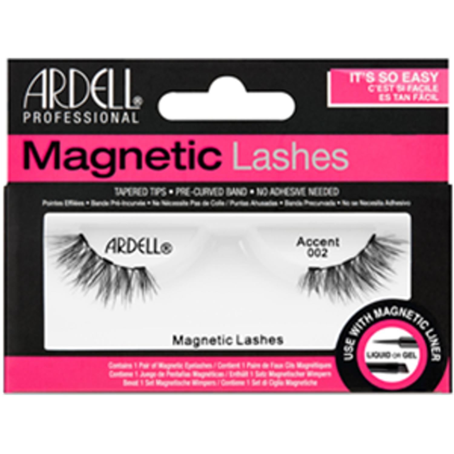 Ardell Accent 002 Magnetic Lashes are quick and easy to apply with no adhesive needed! Simply swipe on some magnetic liner in either a gel or liquid format, and the accent lashes will attach to your lids for a realistic look that's perfect for everyday use and special occasions. The lashes have tapered tips and a pre-curved band for ease of use.