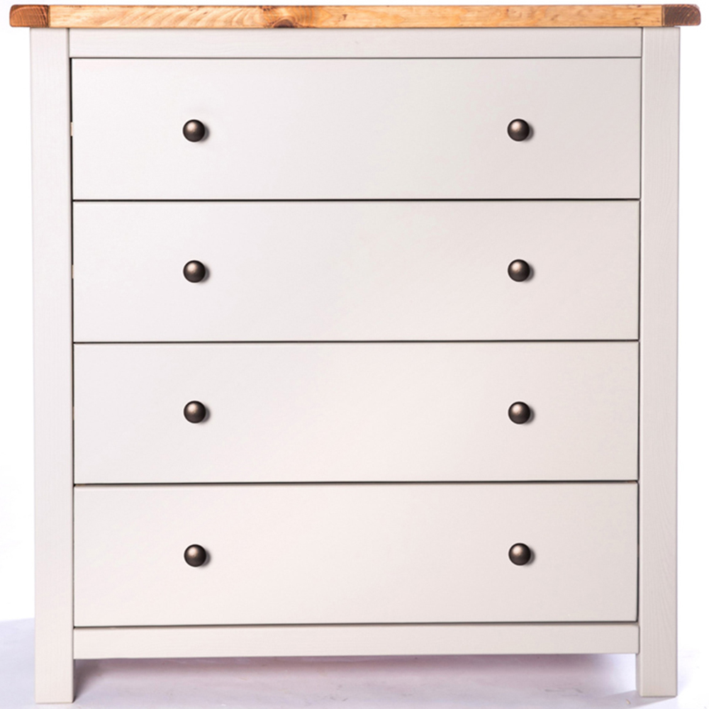 Enhance your home decor with the Argenta 4 Drawer Light Grey Chest of Drawers with Brass Knobs. This storage chest has a waxed pine wood top for keeping a clock or a decorative item. It features four drawers with brass knob handles and ample storage space for keeping your essentials. The body is carefully hand-finished with an eco-friendly water-base lacquer. It is crafted using a combination of solid pine wood and veneers with sturdy feet for stability and support. This storage chest has a simple construction for easy home assembly. It is suitable for all types of traditional and contemporary interior spaces.