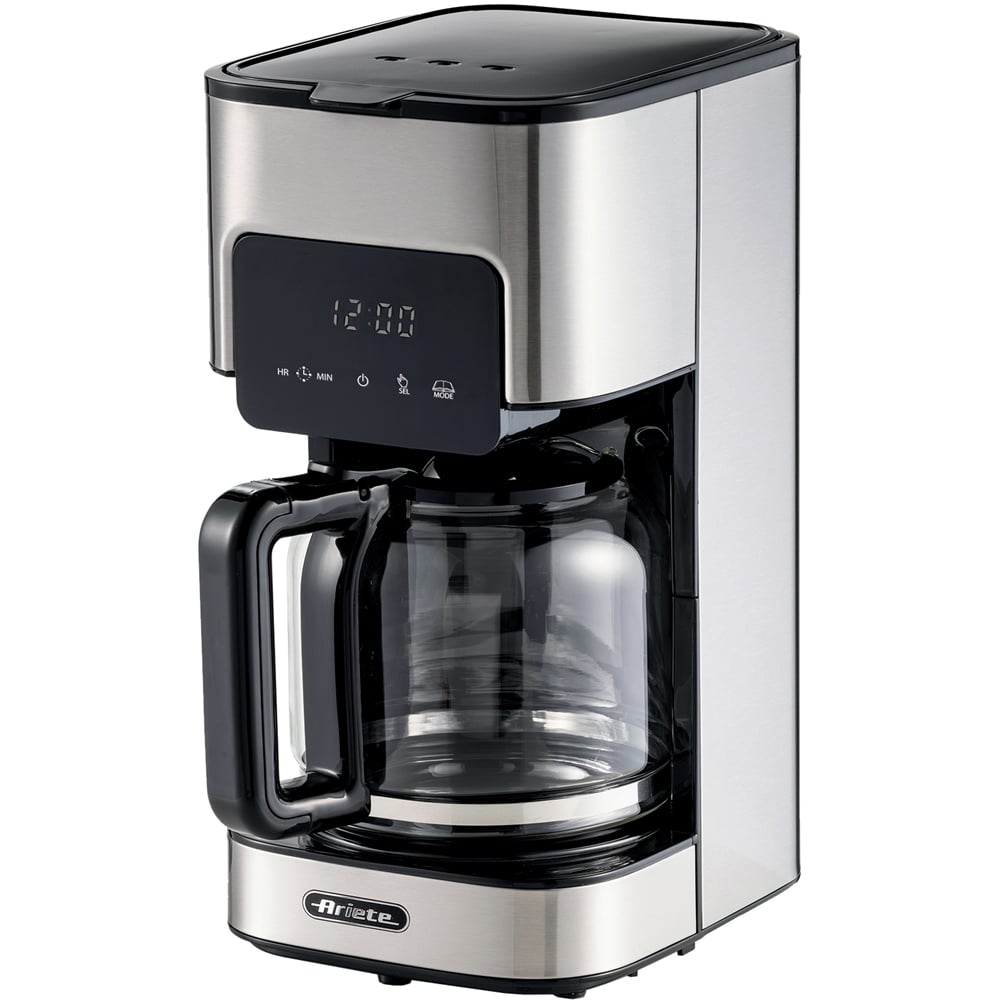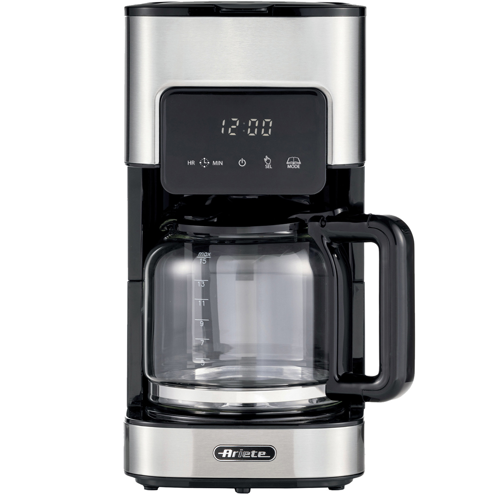 Kick-start your morning with a freshly brewed cup of coffee made with the Ariete AR1398 Black Stainless Steel 1.5L Digital Filter Coffee Machine. It has a clear and stylish LED touchscreen display that can be used to customise the flavour of the drink with a choice of three aroma levels. For busy households, the 24-hour timer is perfect for a freshly brewed pot of coffee, whilst the keep-warm plate prevents the coffee from going cold for up to 30 minutes after brewing. The durable, 1.5L tempered glass jug is large enough to make up to 15 cups, which is ideal for preparing drinks for the whole household. It has an anti-drip system, which automatically stops dispensing for up to 30 seconds once the jug has been removed. Also, it comes with a washable filter that minimises waste and saves money.