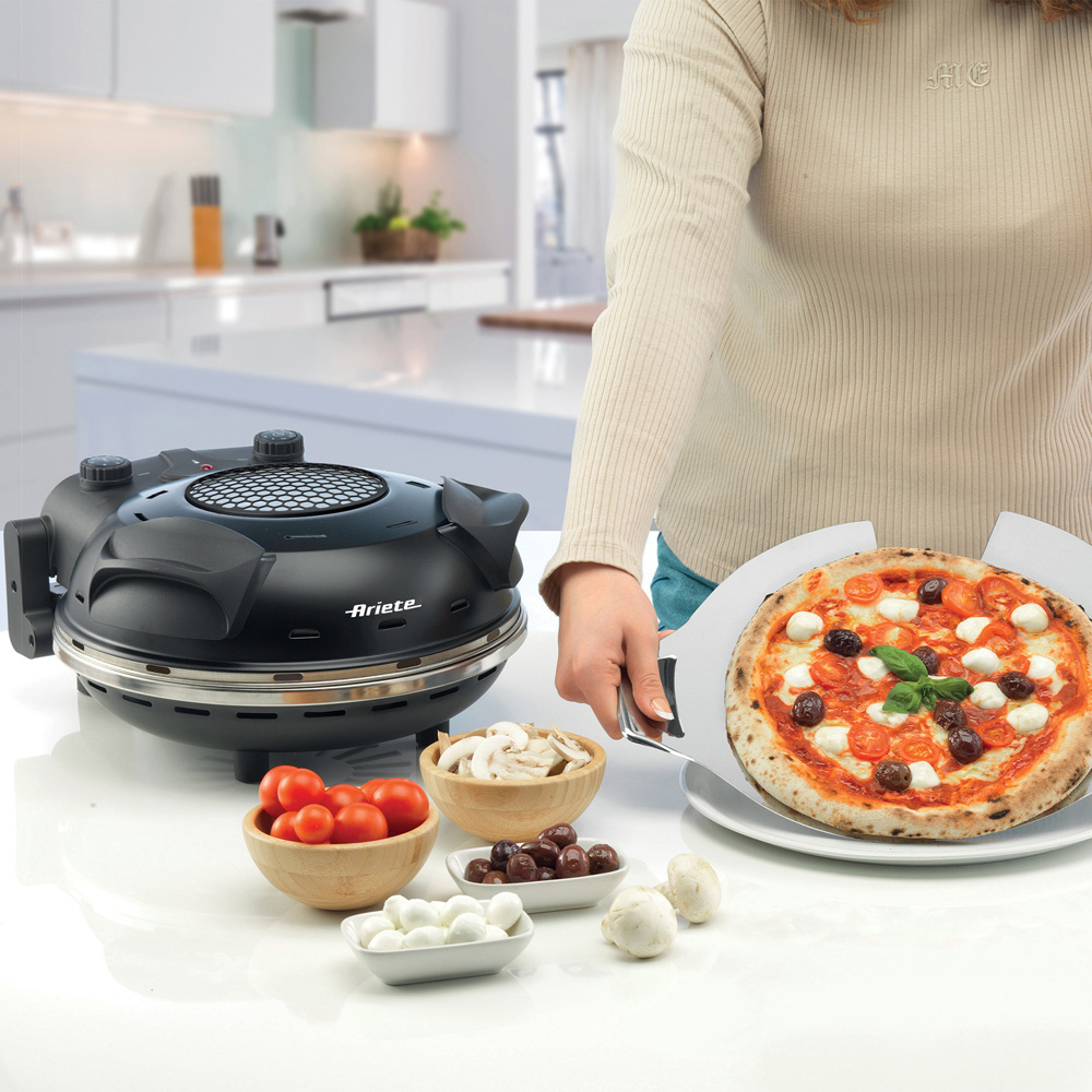 Smartly designed, this Ariete Black Single Pizza Oven will be the ally in the kitchen of all pizza lovers. The product improves its performance with a high quality refractory stone plate with a diameter of 32cm that allows you to cook or heat pizza and focaccia at five cooking levels, up to a maximum temperature of 400 degrees. The refractory stone is equipped with a transparent non-stick treatment that makes cleaning the stone better as residues and oil are not absorbed by the stone itself. Fast cooking at high temperature allows you to replicate the same method of wood-fired ovens and in just four minutes you get a perfect cooking for homemade pizza, and two minutes for frozen pizza. Enjoying pizza at home has never been so quick and easy. Seeing is believing!