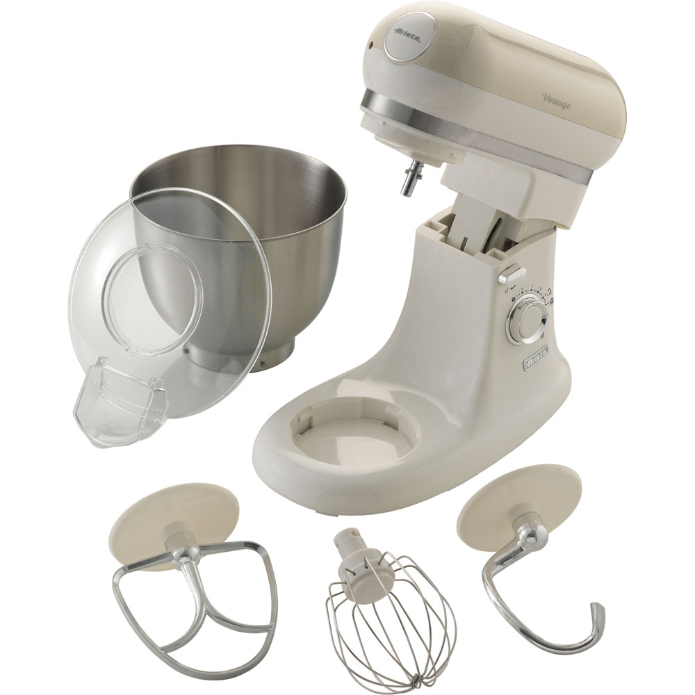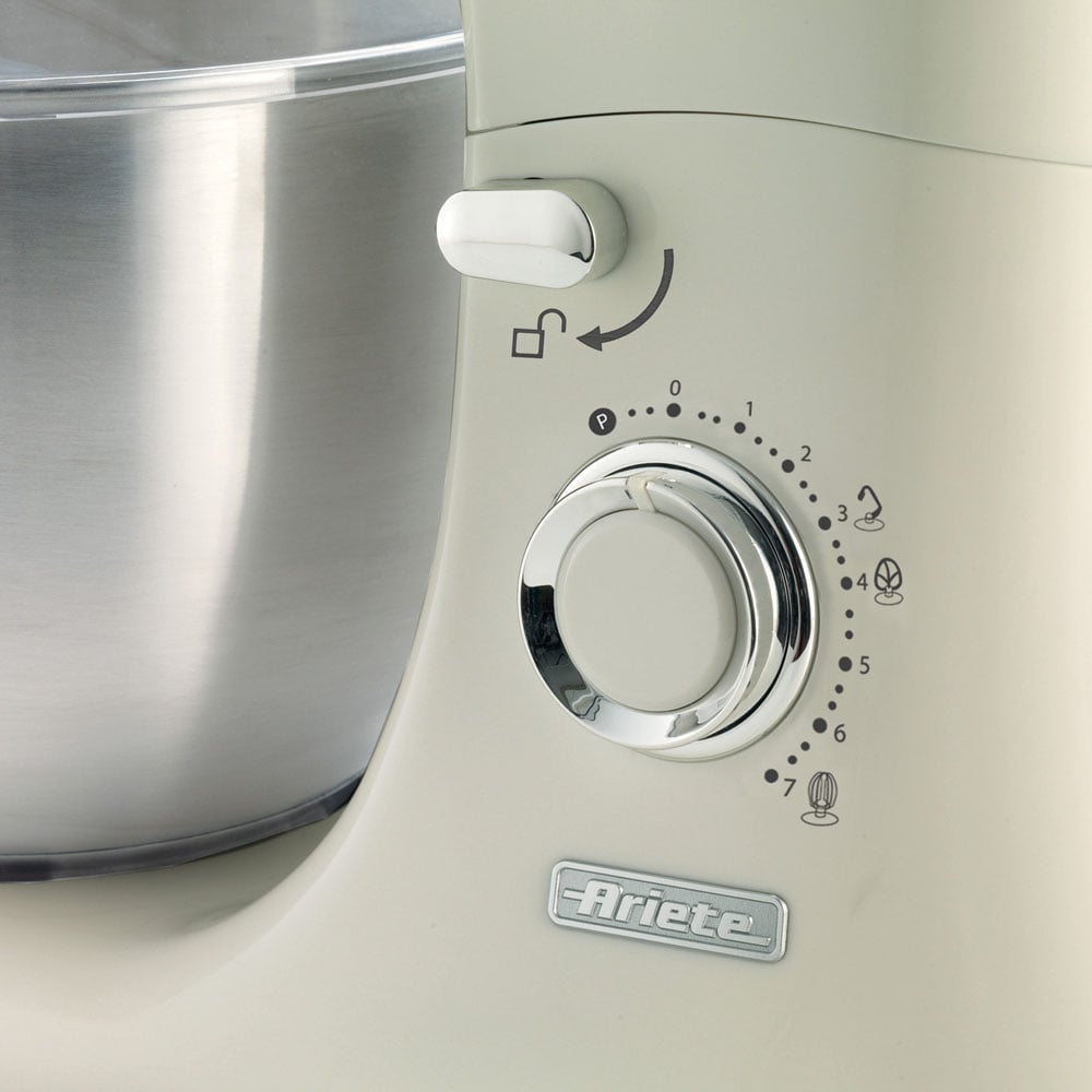 The Ariete Vintage Stand Mixer has an elegant, sophisticated design in cream that combines technology and functionality both for daily meals and for fancy patisserie creations. The motor, which reaches 2400W on maximum power, along with the seven speeds and the pulse function allows it to work even the stiffest and coarsest doughs. The large 5.5L stainless steel bowl and the three whisks supplied, the dough hooks for kneading, the heart-shaped one for mixing and the wire one for beating, allow for a wide range of creations. The non-slip feet and the balance allow the mixer to work at high speed in a secure, stable way, without creating any mess, thanks to the splash guard lid.