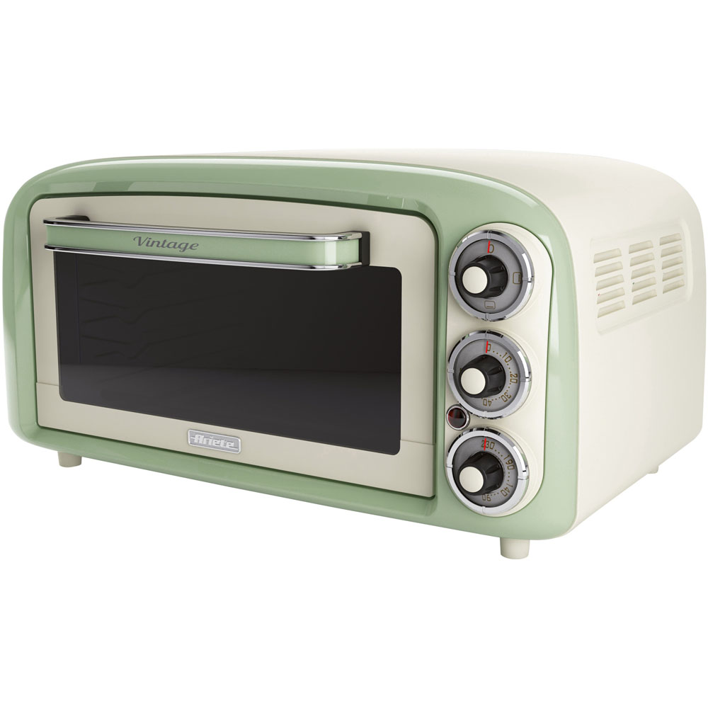 The Ariete Vintage Mini Electric Oven in green is a designer oven which, with its unique shapes and pastel colours, compliments your kitchen. The compact size of this oven makes it easy to find a spot for it in the kitchen. The electric oven has an 18-litre capacity and allows for the possibility of turning on both elements or only the top or bottom element separately, for grilling/defrosting. The timer, which can be set for up to 60 minutes, allows you to program cooking times and the thermostat that regulates the internal temperature up to 230 °C allows you to customise your cooking. The Vintage oven is perfect for making pizza thanks to the round cavity at the back of the oven: it can hold a plate with a diameter of up to 30cm. Dimensions: L 47.5 x W 40 x H 24.5.