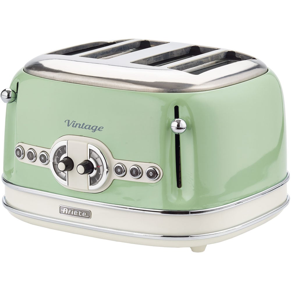 Make a stylish addition to your kitchen with this green-coloured Vintage 4 Slice Toaster from Ariete, featuring unique shapes and pastel colours. It offers four slots, with separate controls for each pair of bread slices, for browning the slices of bread at 6 different toasting levels. When the toast is ready, the automatic eject function allows you to take out the slice of bread safely. The removable crumb tray ensures easy cleaning and the lower cord compartment allows you to save space. The vintage toaster features a sturdy design, and the stainless steel outer walls in pastel colours make it a unique and unmistakable object in the panorama of small kitchen appliances.