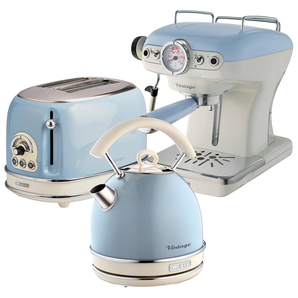 Add practicality to your kitchen with this Ariete Vintage ARPK18 Dome Kettle, 2-Slice Toaster and Espresso Coffee Maker Set. This is the ideal kitchen set for any modern homeowner. The stylish set includes an Ariete Vintage 2-slice toaster, a dome kettle, and an espresso coffee maker, all in a stunning blue finish, making it the perfect kitchen companion for any contemporary home. The vintage kettle features an old-fashioned dome shape, which is sure to look the part of any retro kitchen. This kettle is equipped with a generous 1.7-litre capacity and modern functionalities, including a removable and washable scale filter, an ergonomic handle with soft-touch finishing, and handy cool-touch surfaces. Apart from this, it even features a handy auto-off system, which stops the unit from overheating and becoming a hazard in the home. The espresso machine boasts an elegant, vintage style, enriched with precious pastel-coloured details and metallic finishes. Offering 900W of power and 15-bar pressure, this powerful unit will allow you to enjoy deliciously intense, creamy coffees in no time, from the comfort of your own home. Also, the filter holder is suitable for use with pods and powder and even includes a removable cup holder and drip tray for your convenience. While the 2-slice vintage toaster is a must-have for toasting everything from regular slices of bread to buns, bagels, waffles, crumpets, and more. It offers six levels of browning control, so you can enjoy each slice exactly as you like it. Additionally, the intuitive toast also features handy auto-eject functionality, a removable crumb tray, and cool touch sides. This complete set is the perfect addition to cook your morning breakfast with ease and style. Pack of 3. Model number: ARPK16