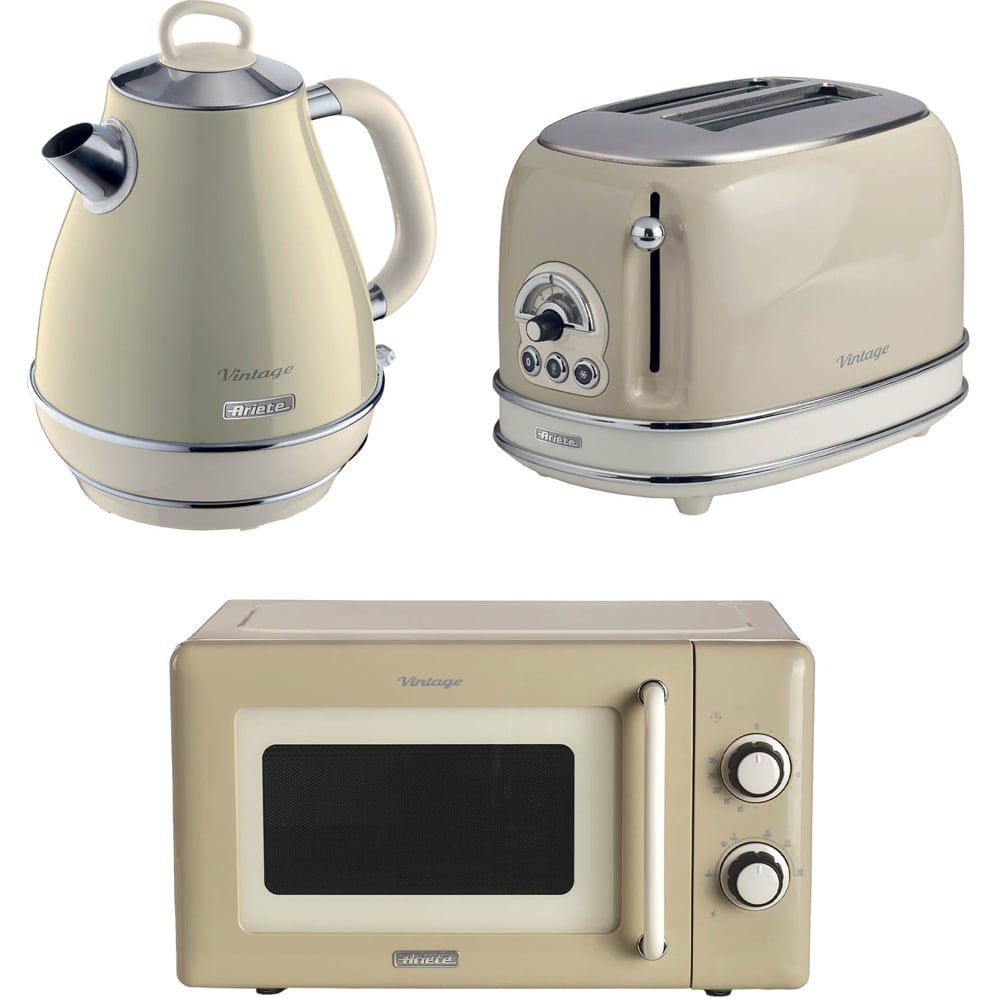 Enhance your kitchen with the Ariete Vintage Kitchen Collection, featuring a designer jug kettle, two slice toaster, and microwave that combine functionality with elegant pastel colours and unique shapes. The Vintage Kettle brings style and efficiency to your countertop. With a 1.7L capacity and 2000W of power, it boils water in moments, perfect for teas, infusions, and herbal drinks. The 360-degree swivel base ensures easy placement, while the cold-touch handle and stainless steel walls provide safety against accidental burns. With a one-touch start, it automatically turns off when the water reaches boiling point or when empty for added security. Complementing the kettle, the Vintage Toaster adds charm while offering six toasting levels for the perfect slice. The two-slot design accommodates various bread sizes, while the automatic eject function ensures safe handling. A removable crumb tray simplifies cleaning, and a cord storage compartment saves space. The sturdy stainless steel exterior in soft pastel hues makes it a standout addition to any kitchen. For quick and efficient meal prep, the Vintage Microwave is ideal for heating, cooking, and defrosting a variety of dishes. More than just a reheating tool, it allows you to prepare healthy meals without added fat or oil, using advanced microwave technology for fast and even cooking. With their timeless design and reliable performance, these appliances bring both beauty and convenience to your kitchen.