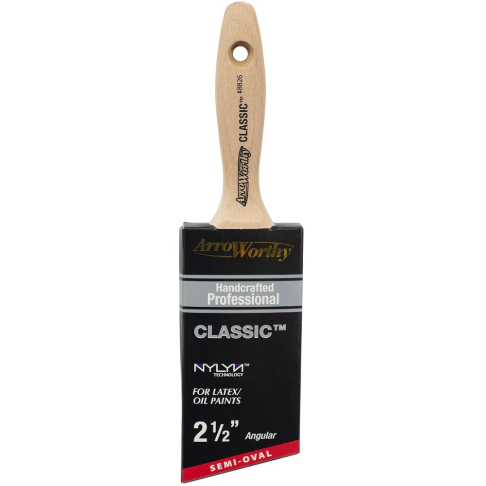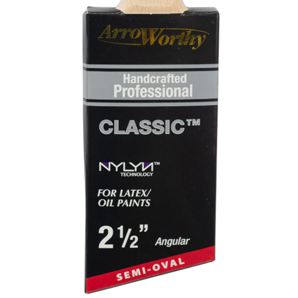 Upgrade your painting toolkit with the ArroWorthy Classic 2.5 inch Nylyn Semi Oval Angled Beaver Tail Paint Brush. It is a meticulously handcrafted professional paintbrush. It is perfect for both water-based and oil-based paints, ensuring a superior finish on every project. Its beaver tail handle is designed for comfort, providing a secure grip. The semi-oval angle design allows for precise control, helping you to achieve clean lines and smooth coverage. Plus, it is handcrafted to provide a professional finish every time. Whether you are a DIY enthusiast or a professional decorator, this brush is an excellent choice for all your decorating jobs.