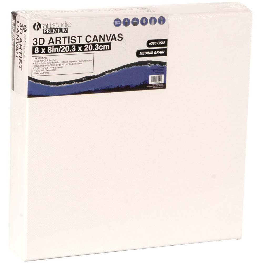 Made from 100% acid free cotton, the Art Studio 3D Artist Canvas is triple primed and ready to use. They are perfect for oil and acrylic paints, mixed medias and other heavy textures. Back stapled to provide a clean edge for painting on the side, this canvas is perfect for students, professionals and hobbyists.