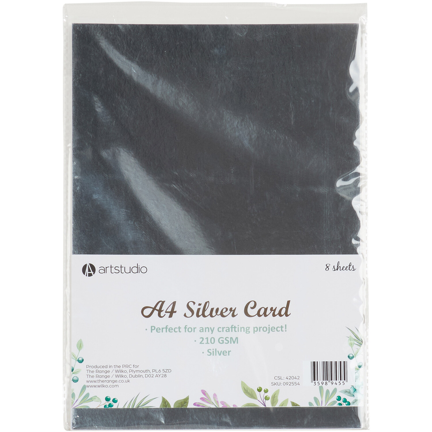 Featuring a metallic silver finish, this Art Studio A4 Silver Card is the perfect addition to your craft collection. Available in a pack of eight 210 GSM paper sheets, the high-quality, thick cardstock is suitable for several craft projects including scrapbooking, card-making, and gift tags. The metallic tone lends an attractive, luxurious feel that's ideal for any occasion, making it versatile and easy to use in any project.